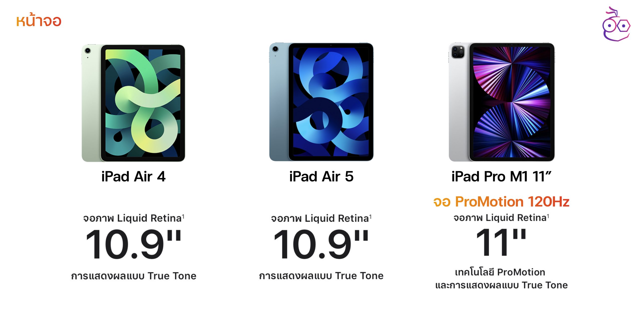 | หน้าจอ | Liquid Retina ขนาด 10.9″ | Liquid Retina ขนาด 10.9″ | Liquid Retina ขนาด 11″