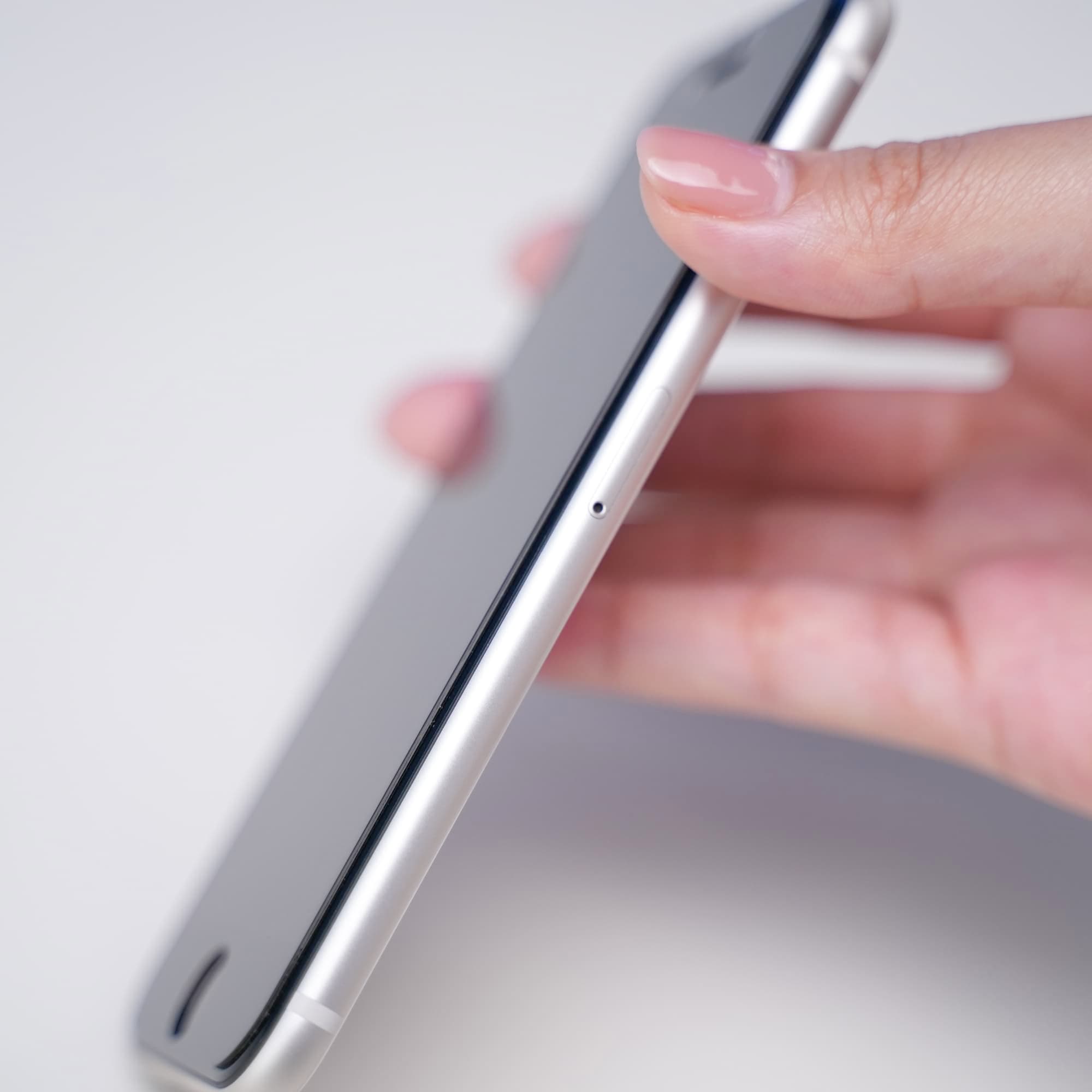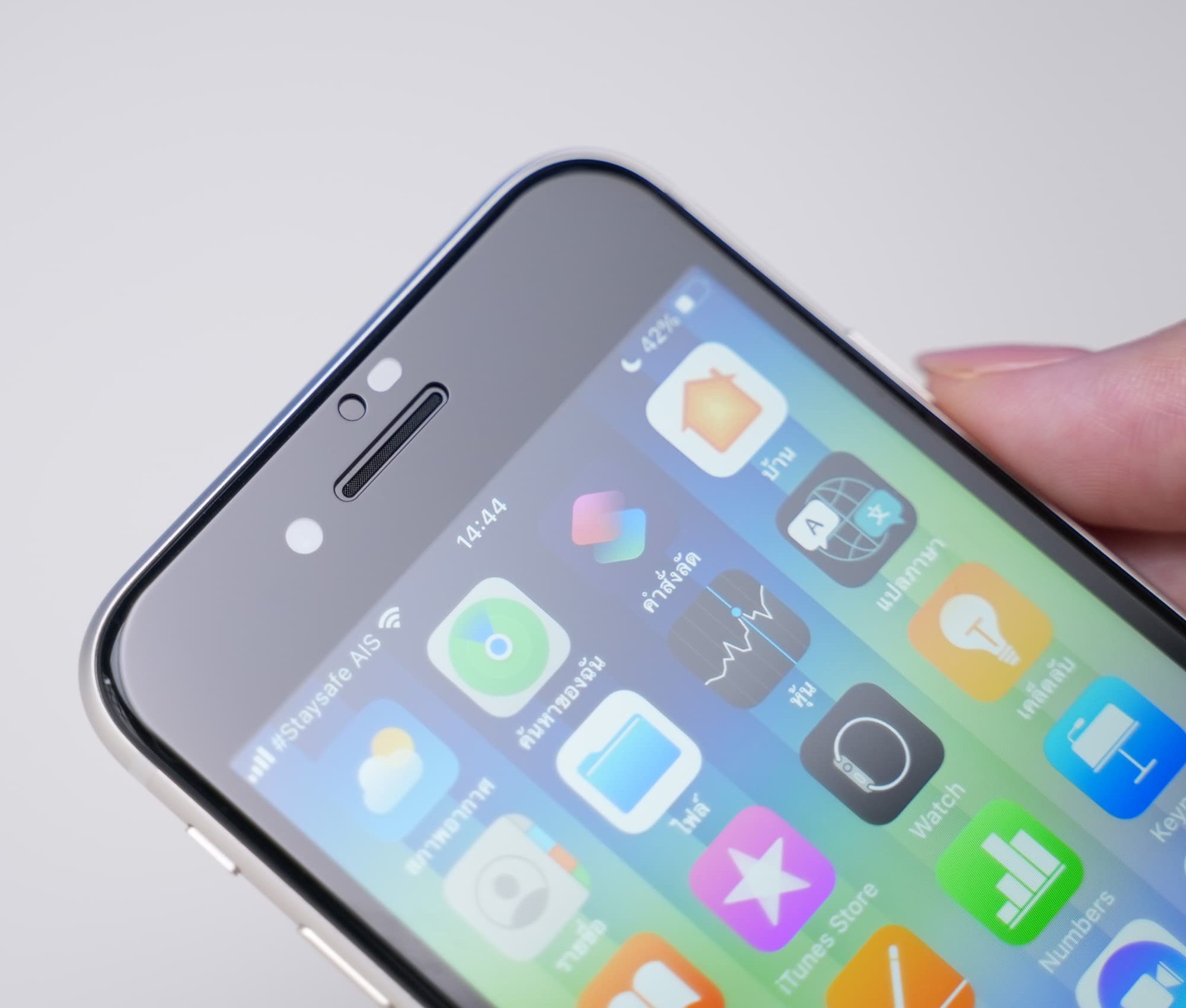 ตัวกระจกกันรอยถูกตัดออกมาให้พอดีกับหน้าจอ iPhone SE 3 มีการเว้นช่องสำหรับกล้องหน้า ลำโพง และปุ่ม Touch ID ได้พอดี
