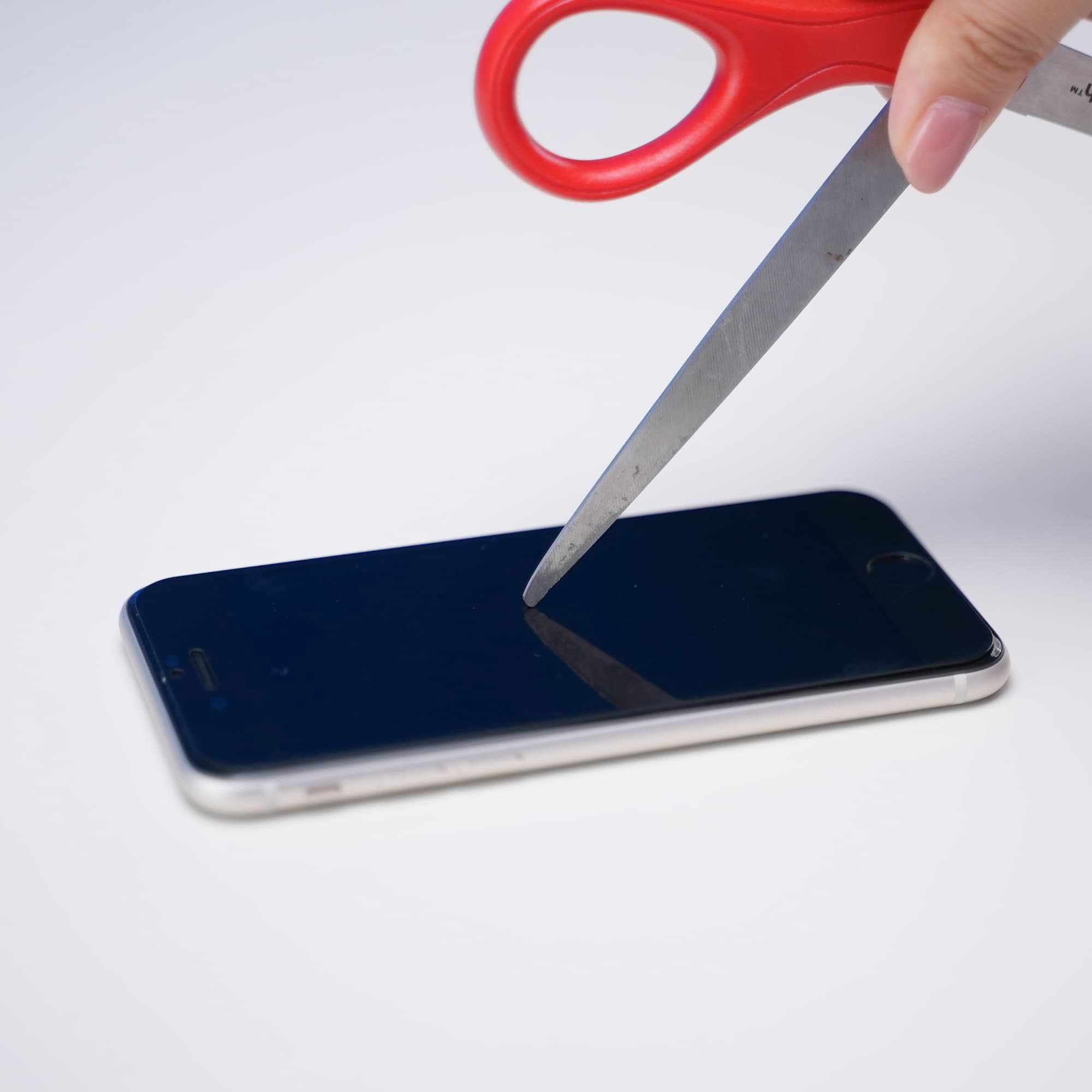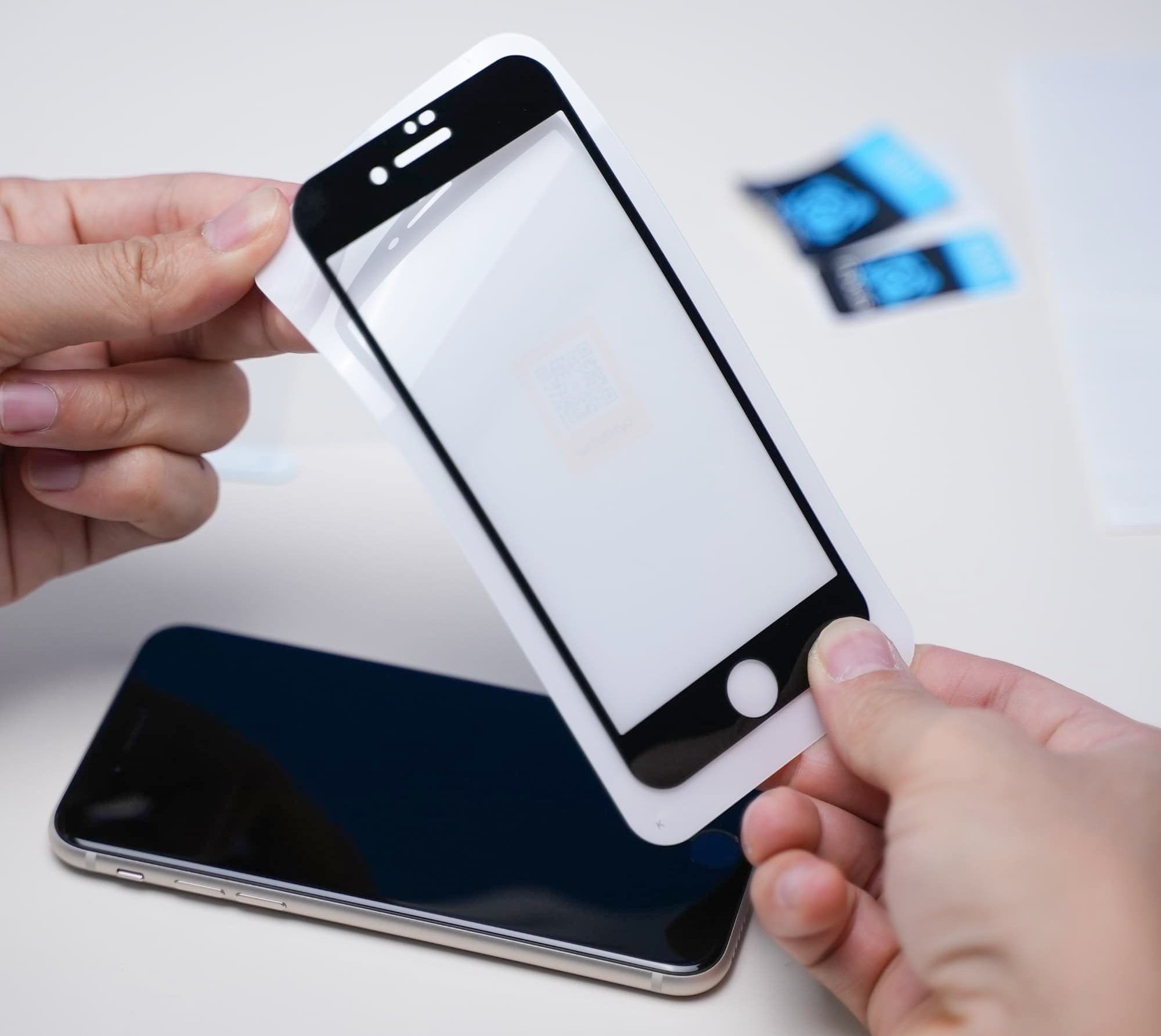 ลอกแผ่นอะคริลิคออกจากฟิล์มกระจก จากนั้นให้กะระยะฟิล์มให้ตรงกับหน้าจอ iPhone แล้วค่อย ๆ วางฟิล์มกระจกลงบนหน้าจอ โดยเริ่มจากตำแหน่งลำโพงหรือกล้องหน้า