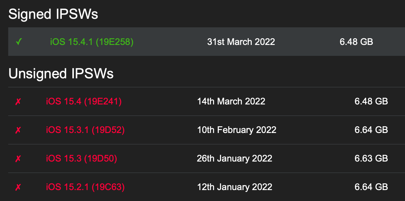 นั่นหมายความว่าผู้ใช้  ไม่สามารถ Downgrade, Signing, Restore หรือติดตั้ง Firmware iOS 15.4 (iPadOS 15.4) ได้ โดยในตอนนี้สามารถติดตั้งได้เพียง iOS 15.4.1 เท่านั้น (8 เม.ย. 65)