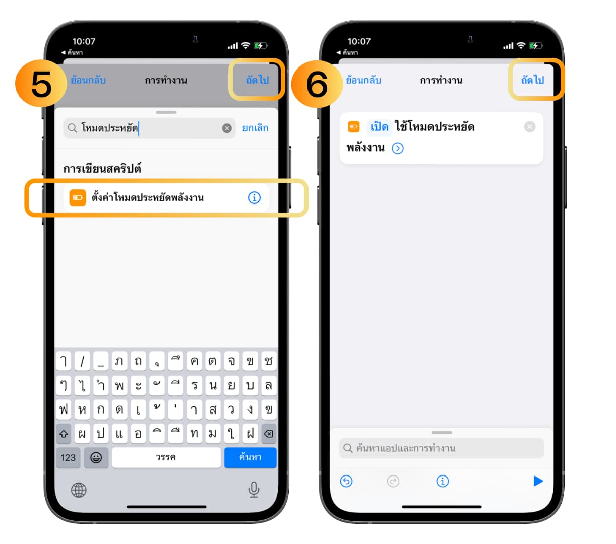 5. ค้นหาการทำงานโดยพิมพ์คำว่า “ตั้งค่าโหมดประหยัดพลังงาน” แตะเลือกการทำงานนั้น แล้วแตะ ถัดไป