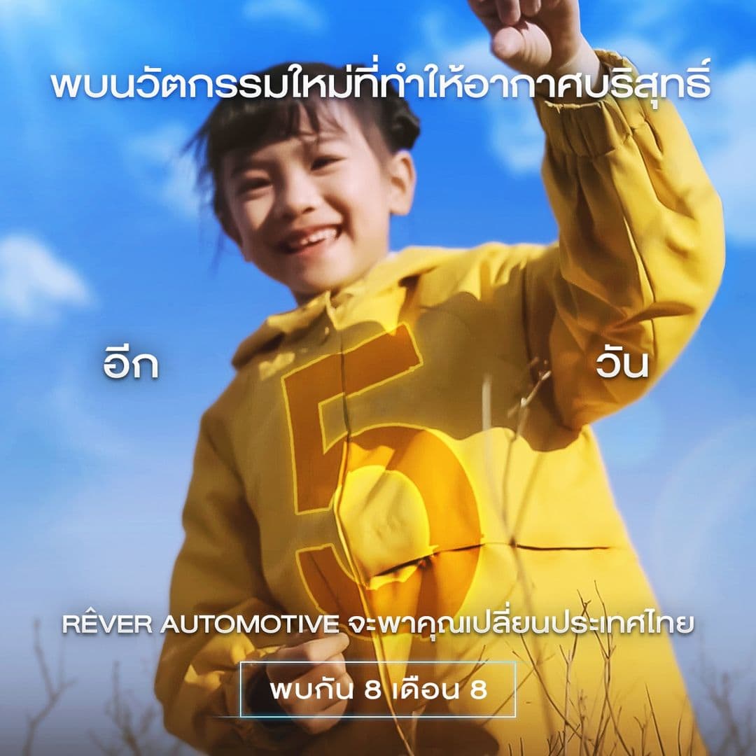BYD RÊVER Thailand ประกาศผ่านหน้า Facebook นับถอยหลัง 5 วัน เปิดแบรนด์ในไทยอย่างเป็นทางการ 8 ส.ค. 65 นี้ อาจมาพร้อมนวัตกรรมเกี่ยวกับอากาศบริสุทธิ์ สื่อถึงรถยนต์ที่ปล่อยคาร์บอนเป็นศูนย์ ปูทางสู่การเปิดตัว BYD Dolphin อย่างเป็นทางการในไทย