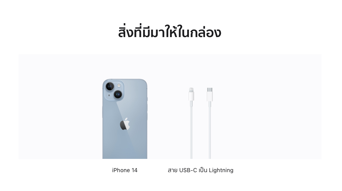 iPhone ทุกรุ่นในตอนนี้ รวมถึง iPhone 14 ยังคงใช้พอร์ตเชื่อมต่อและพอร์ตชาร์จแบบ Lightning อยู่ หากมีสาย Lightning อยู่แล้วไม่ต้องซื้อเพิ่ม เพราะ Apple แถมสายชาร์จ USB-C to Lightning มาให้ในกล่องด้วย