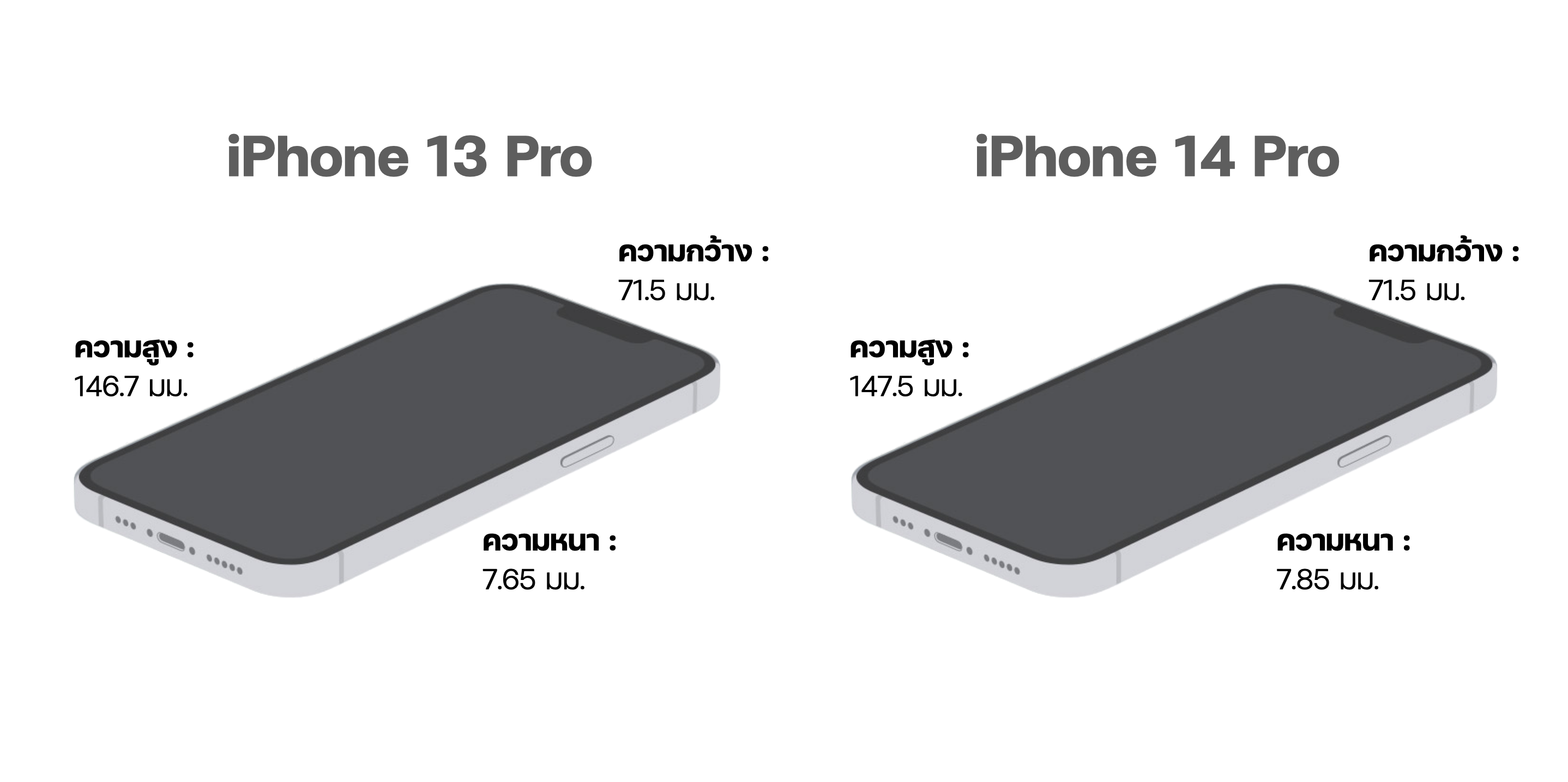 ก่อนอื่นมาดูข้อมูลเปรียบเทียบกันก่อน หากอ้างอิงจากขนาดตัวเครื่องของ iPhone 13 และ iPhone 14 จะเห็นได้ว่าไม่ค่อยต่างกันมาก จะต่างกันตรงความสูงและน้ำหนัก