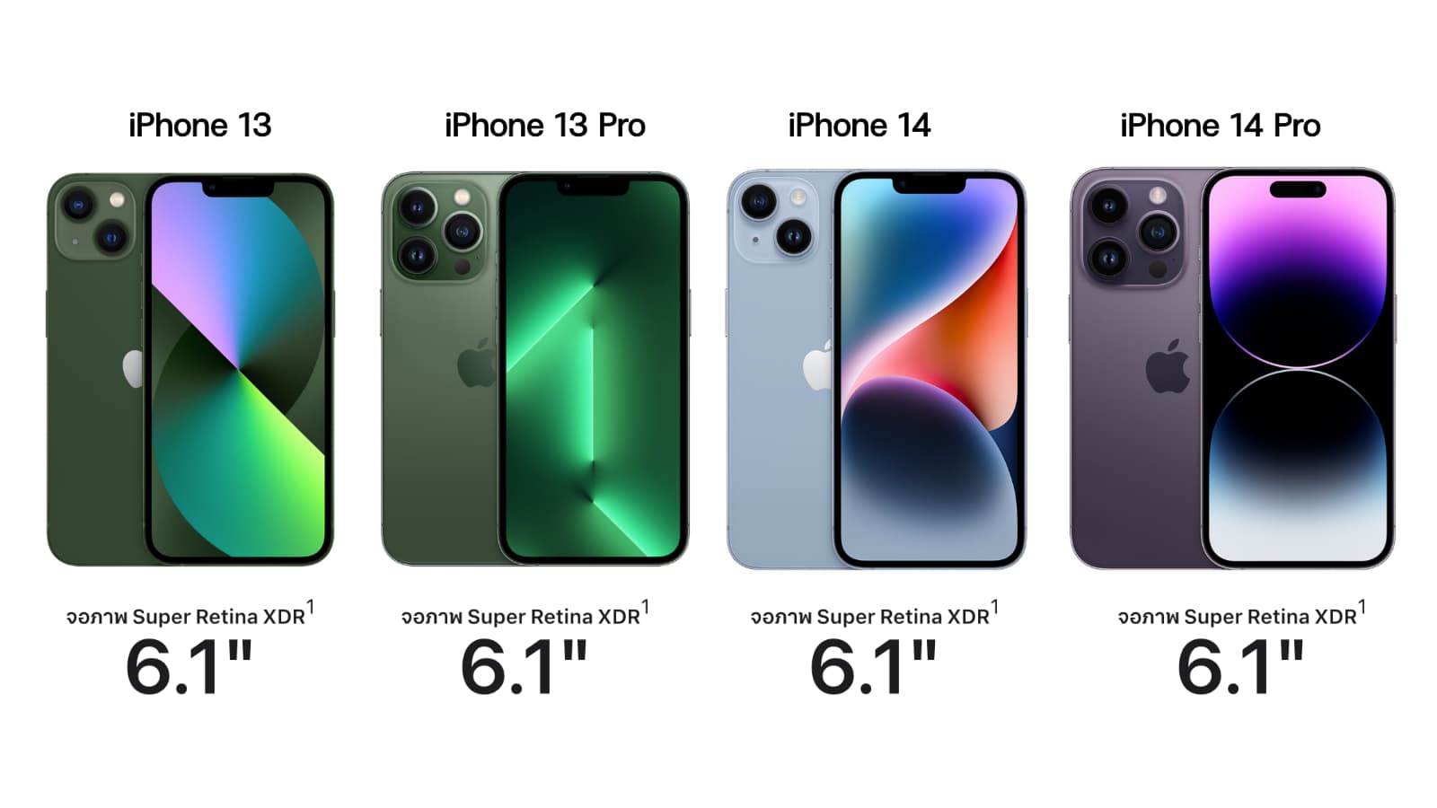 หน้าจอ iPhone 13, iPhone 13 Pro, iPhone 14, iPhone 14 Pro มีขนาด 6.1″ เท่ากัน ดังนั้น แปลว่าสามารถใช้ฟิล์มร่วมกันได้ เพราะ iPhone 13 และ iPhone 14 มีตำแหน่งและขนาดการจัดวางลำโพงที่เท่ากัน