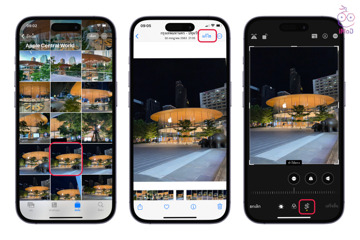 ไปที่แอป รูปภาพ (Photos) > เลือกรูปภาพที่ต้องการ แล้วแตะ แก้ไข (Edit) > แตะไอคอนครอปรูป ด้านล่าง