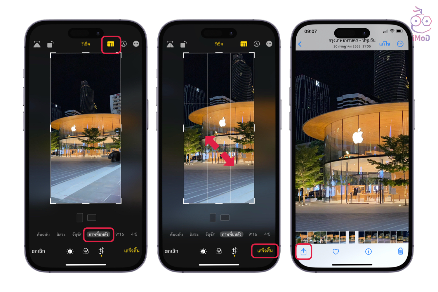 แตะไอคอนครอปรูปภาพด้านบน แล้วแตะ ภาพพื้นหลัง (Wallpaper) ด้านล่าง > ใช้ 2 นิ้ว ย่อ ขยาย หรือเลื่อนตำแหน่งที่ต้องการ แล้วแตะ เสร็จสิ้น (Done) > หากต้องการตั้งเป็นภาพพื้นหลัง ให้แตะไอคอน แชร์ ด้านล่าง