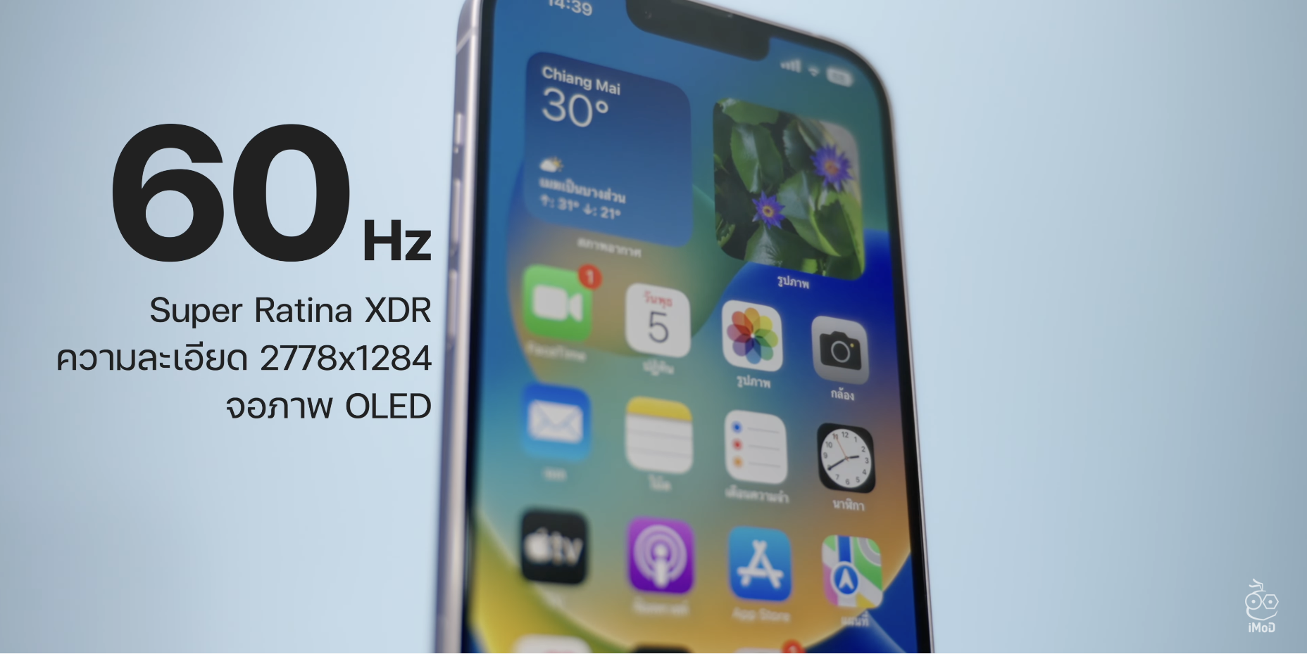 หน้าจอ iPhone 14 Plus มีอัตรารีเฟรชอยู่ที่ 60Hz จอภาพ OLED ความละเอียด 2778×1284 พิกเซล