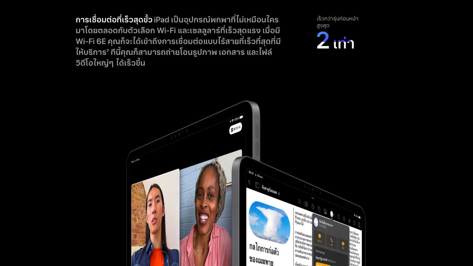 iPad Pro M2 รองรับการเชื่อมต่อ Wi-Fi 6E มอบการเชื่อมต่อที่รวดเร็วยิ่งขึ้น ดาวน์โหลดได้สูงสุดถึง 2.4Gb/s ซึ่งเร็วกว่า iPad Pro M1 ถึง 2 เท่า ในรุ่น Wi-Fi + Cellular พร้อม 5G ที่รวดเร็ว