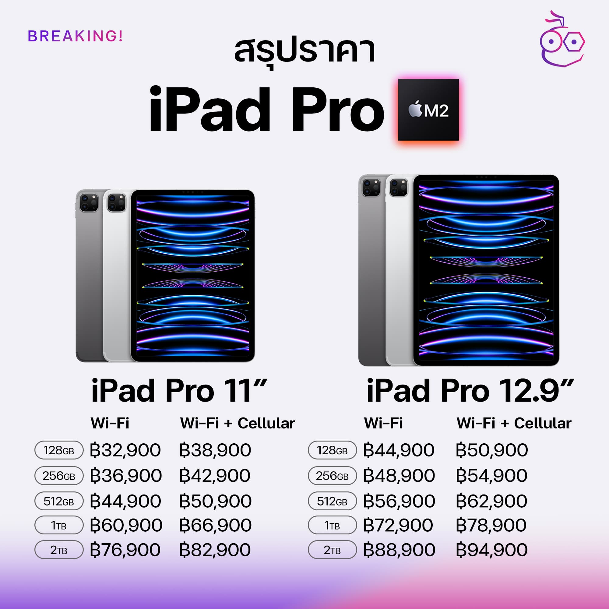 18 ต.ค. 2022, Apple เปิดตัว iPad Pro รุ่นใหม่ 2022 มาพร้อมชิป M2 ยังมาในสองขนาดหน้าจอ 11″ และ 12.9″ ตัวเครื่องดีไซน์เดิม, Wi-Fi 6E, รองรับการถ่ายวิดีโอ ProRes, และมอบประสบการณ์การยกปลาย Apple Pencil ครั้งแรกใน iPad ราคาเริ่มต้น 32,900 บาท