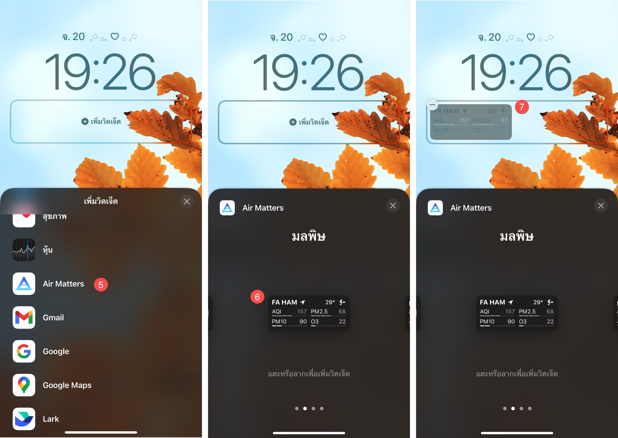 เลื่อนลงมาหาวิดเจ็ตแอป Air Matters > เลื่อนหาวิดเจ็ตมลพิษ > แตะที่วิดเจ็ตเพื่อวางลงในตำแหน่งที่ต้องการ
