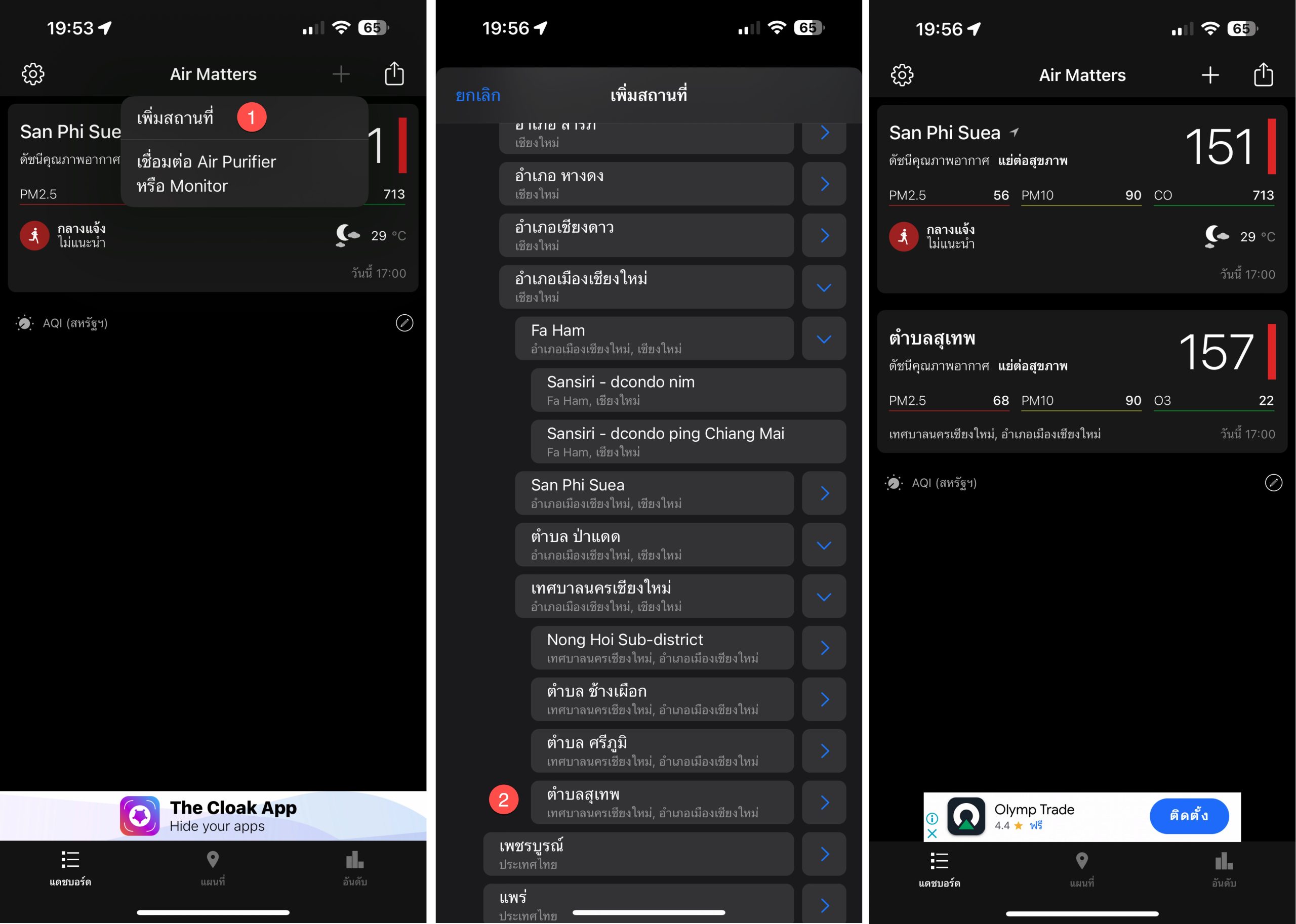 เปิดแอป Air Matters > แตะ + เพิ่มสถานที่ > เลือกตามต้องการ