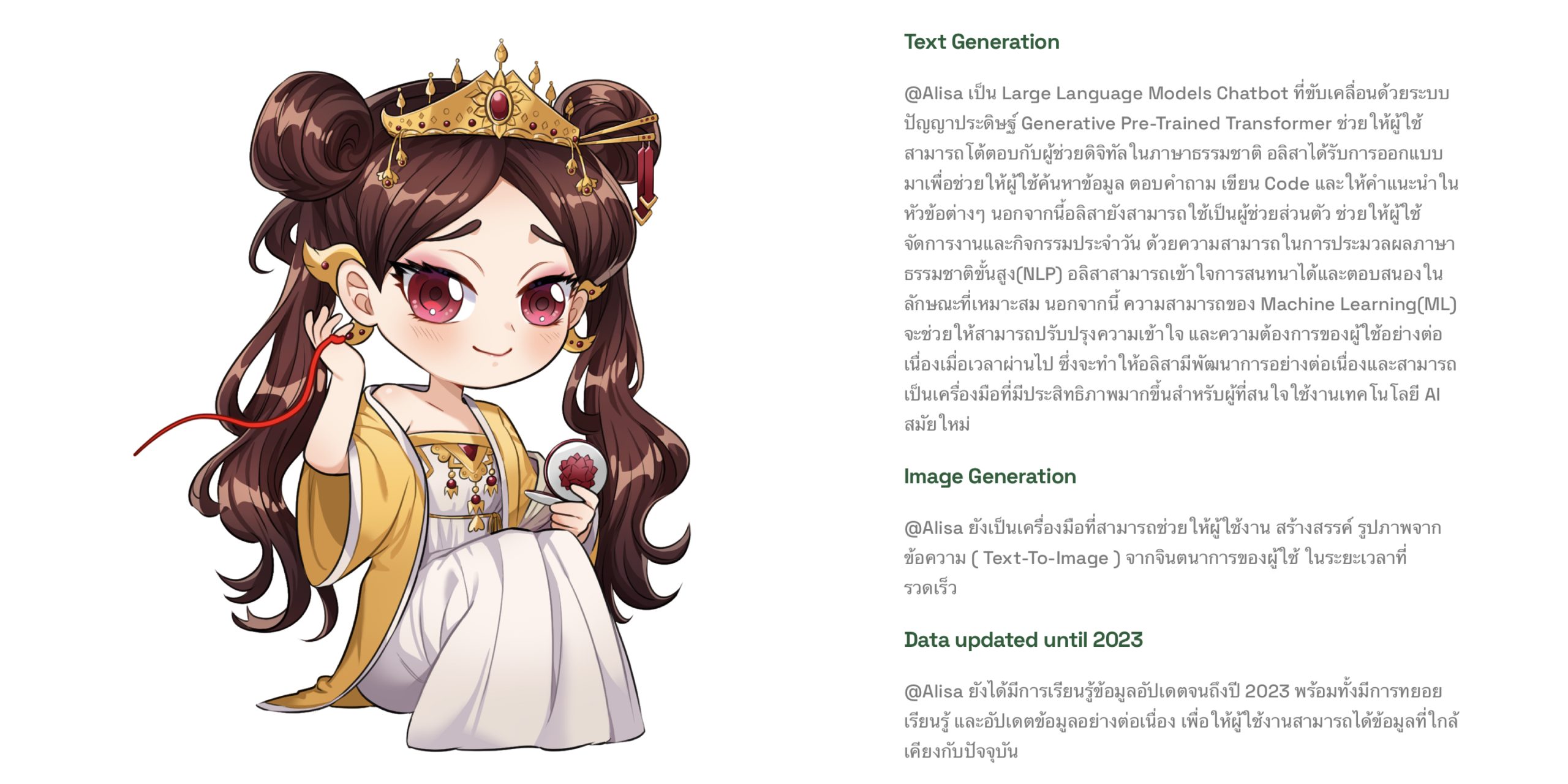 - 5. อลิสาเรียนรู้และอัปเดตฐานความรู้อย่างต่อเนื่องเพื่อให้ข้อมูลที่เป็นปัจจุบันและแม่นยำที่สุดแก่ผู้ใช้