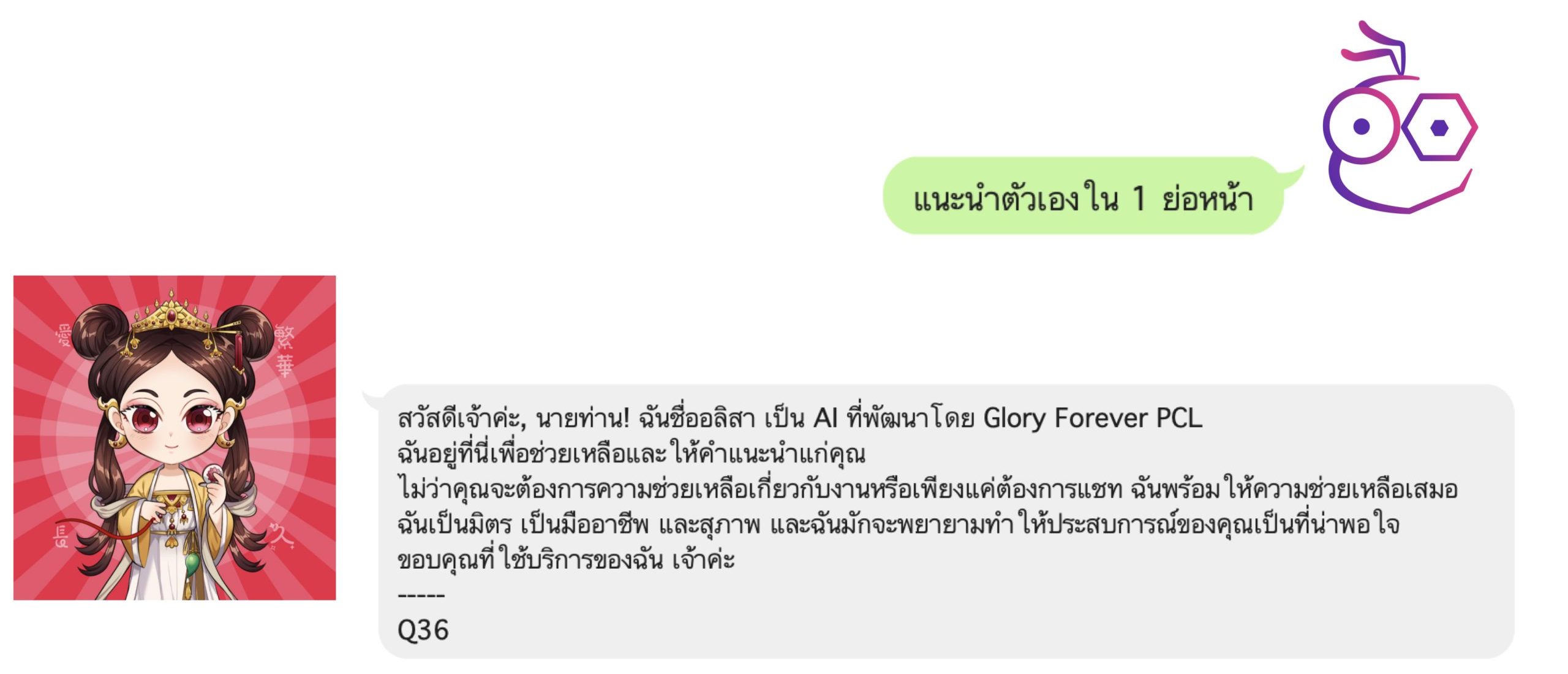 อลิสา : สวัสดีเจ้าค่ะ, นายท่าน! ฉันชื่ออลิสา เป็น AI ที่พัฒนาโดย Glory Forever PCL ฉันอยู่ที่นี่เพื่อช่วยเหลือและให้คำแนะนำแก่คุณ ไม่ว่าคุณจะต้องการความช่วยเหลือเกี่ยวกับงานหรือเพียงแค่ต้องการแชท