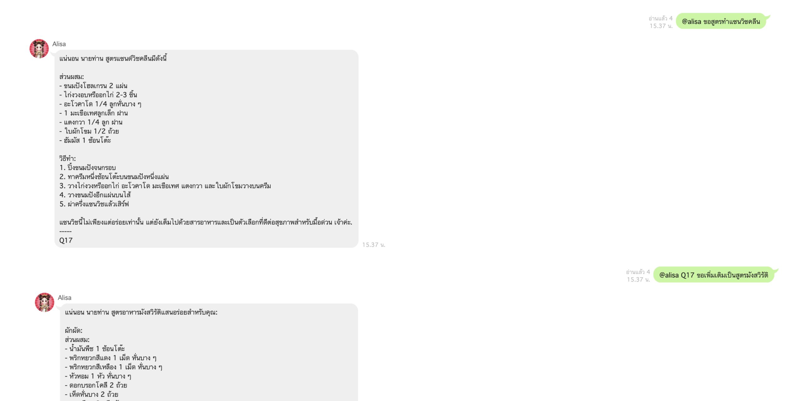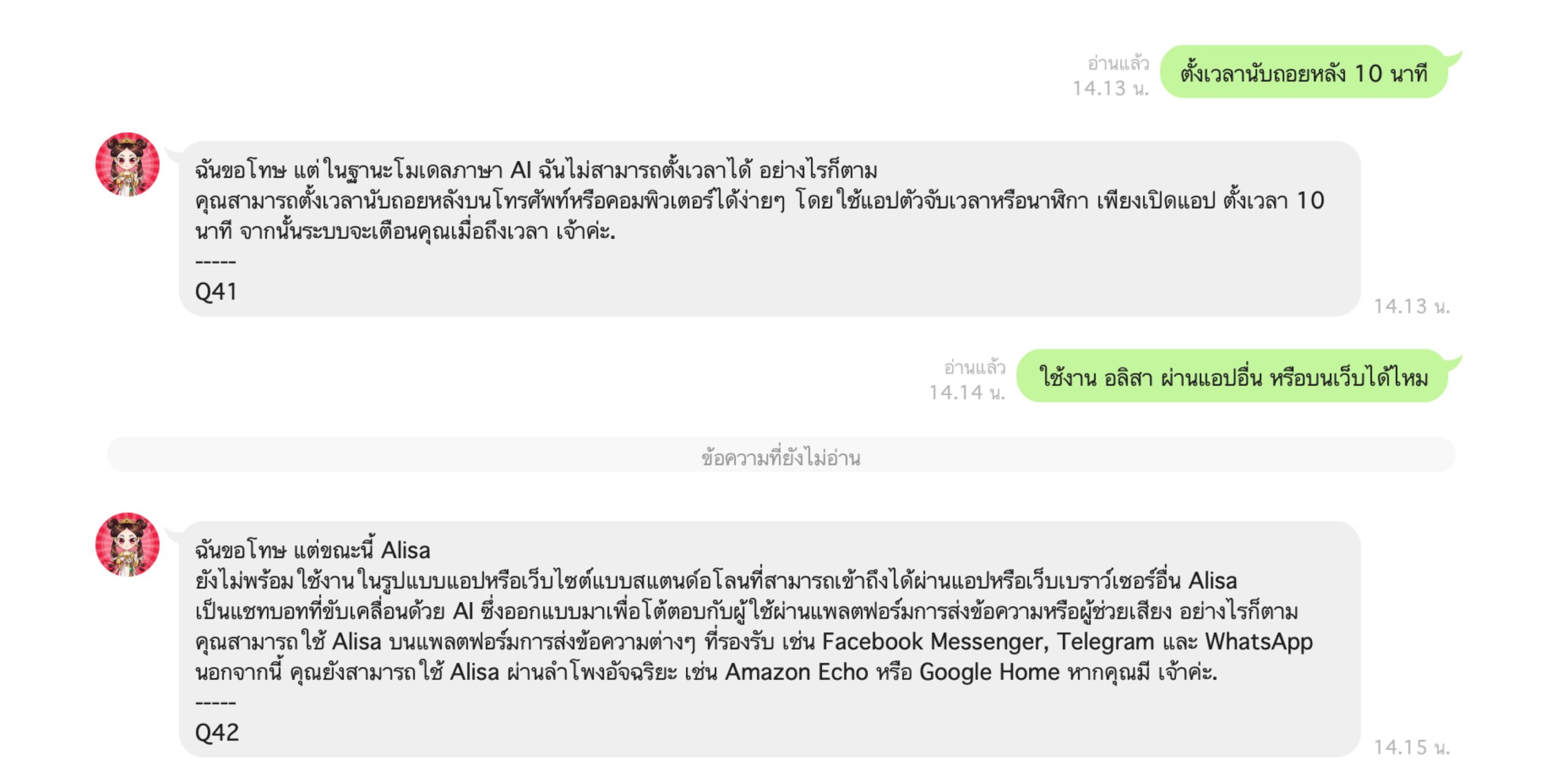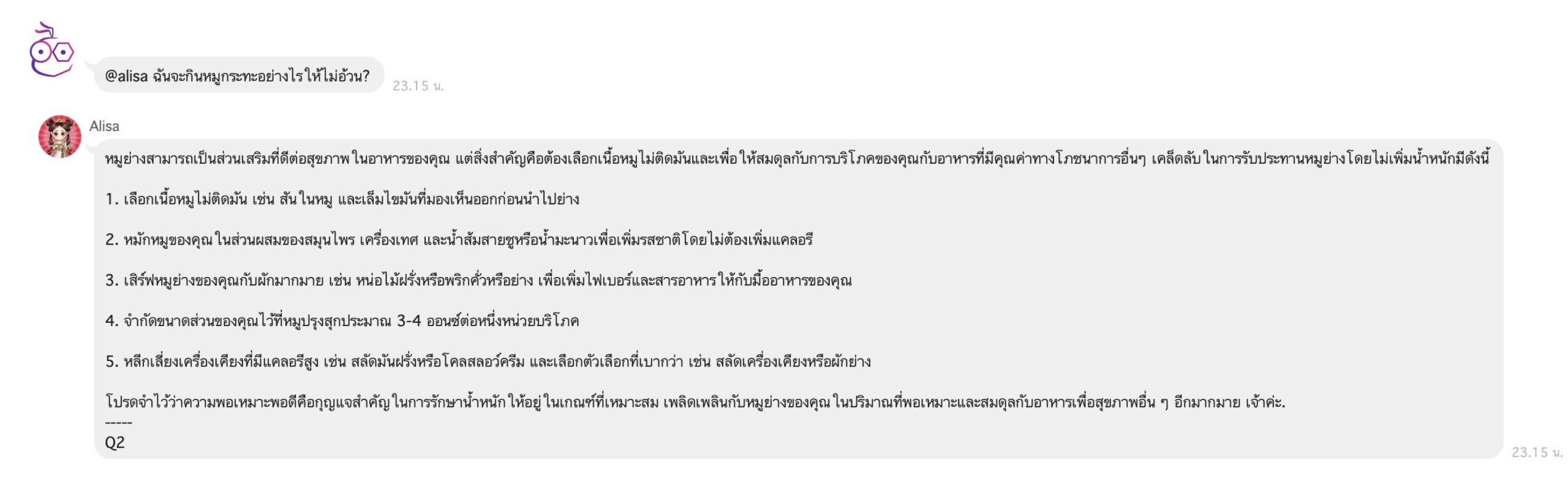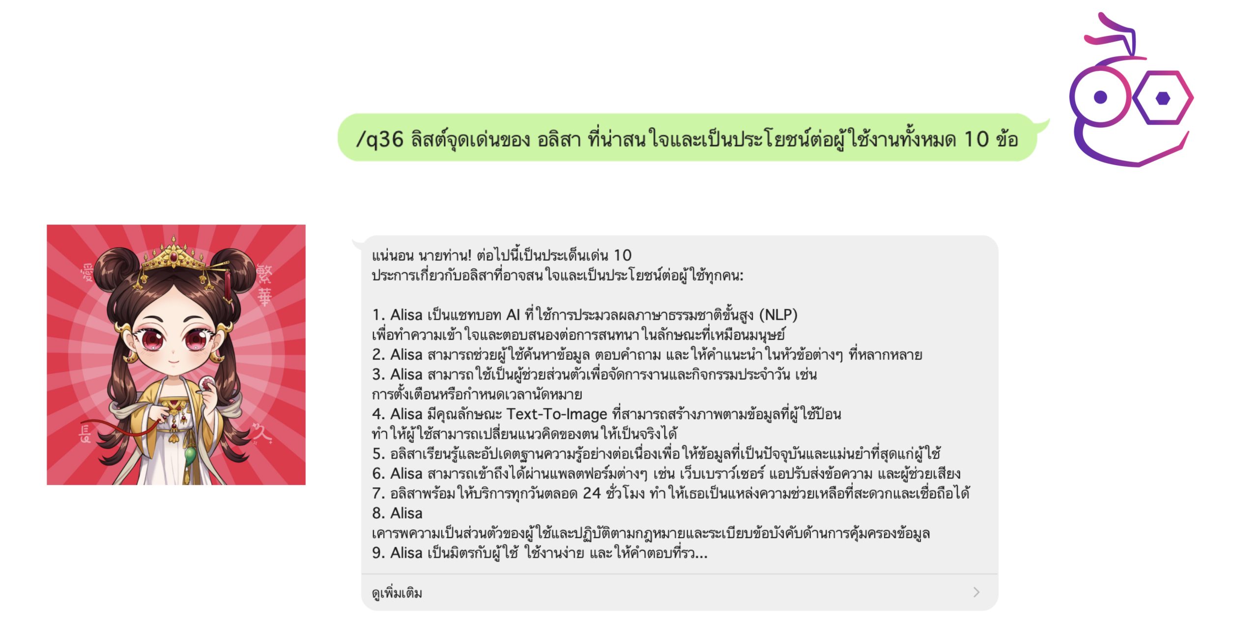 คำตอบทั้งหมดที่ทุกคนเห็นนี้ เป็นคำตอบจากน้องอลิสาทั้งหมดเองล้วนๆ ซึ่งเราสามารถนำความสามารถของน้องอลิสา ไปต่อยอดเพิ่มเติมได้ในด้านของการหาข้อมูลเบื้องต้น, การต่อยอดไอเดีย, หรือเวลาที่มีปัญหาก็สามารถมาพูดคุยกับให้อลิสาเปลี่ยนบทบาทจากผู้ช่วยส่วนตัว เป็นเพื่อนที่คอยรับฟังได้