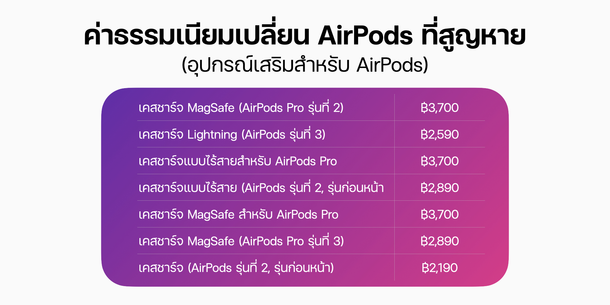หากใครที่ทำ AirPods หายเพียงข้างใดข้างหนึ่ง หรือเคสชาร์จสูญหาย ก็สามารถเข้าใช้บริการนี้ได้เลยโดยไม่ต้องเปลี่ยนหรือซื้อใหม่ยกเซ็ตนั่นเอง เช็คราคาเปลี่ยน AirPods ที่สูญหายแต่ละรุ่น แต่บริการนี้ AppleCare+ สำหรับหูฟังจะไม่ครอบคลุม AirPods ที่สูญหายหรือถูกขโมย