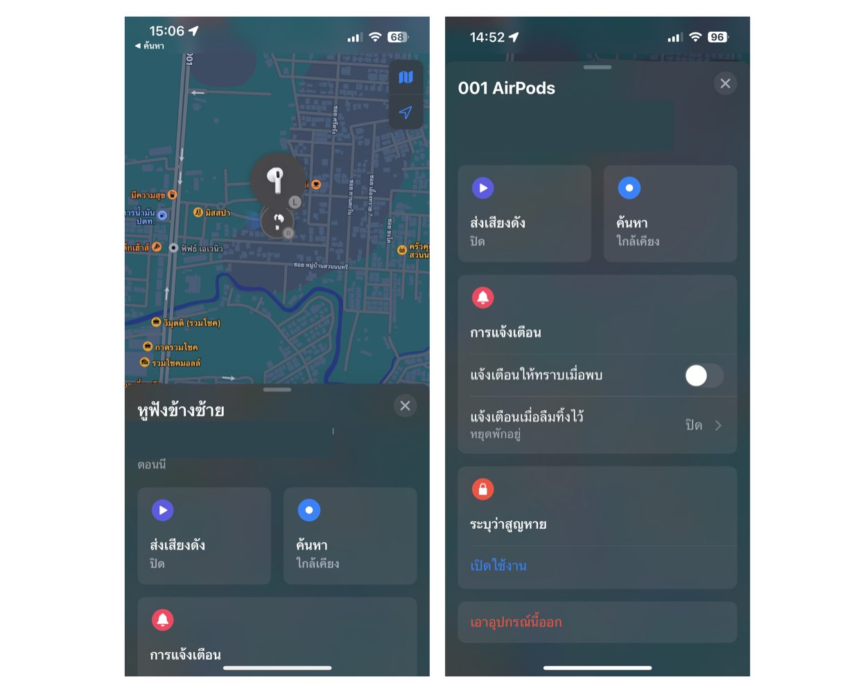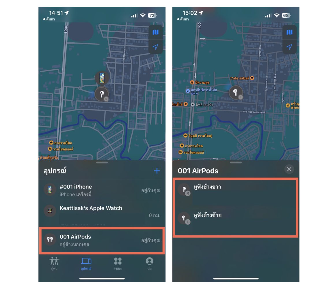 วิธีการคือ ไปที่แอป Find My > เลือก “อุปกรณ์” > แตะชื่อ AirPods ที่ต้องการค้นหา หากทำ AirPods หายข้างเดียวจะขึ้นสถานะ “อยู่ข้างนอกเคส”