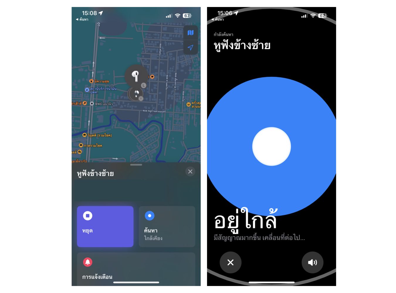 แอปจะแสดงตำแหน่งที่ตั้งของหูฟังทั้งสองข้างบนแผนที่ > เลือกหูฟังข้างที่ต้องการค้นหา > แอปจะแสดงตัวเลือกการค้นหาขึ้นมา ได้แก่
