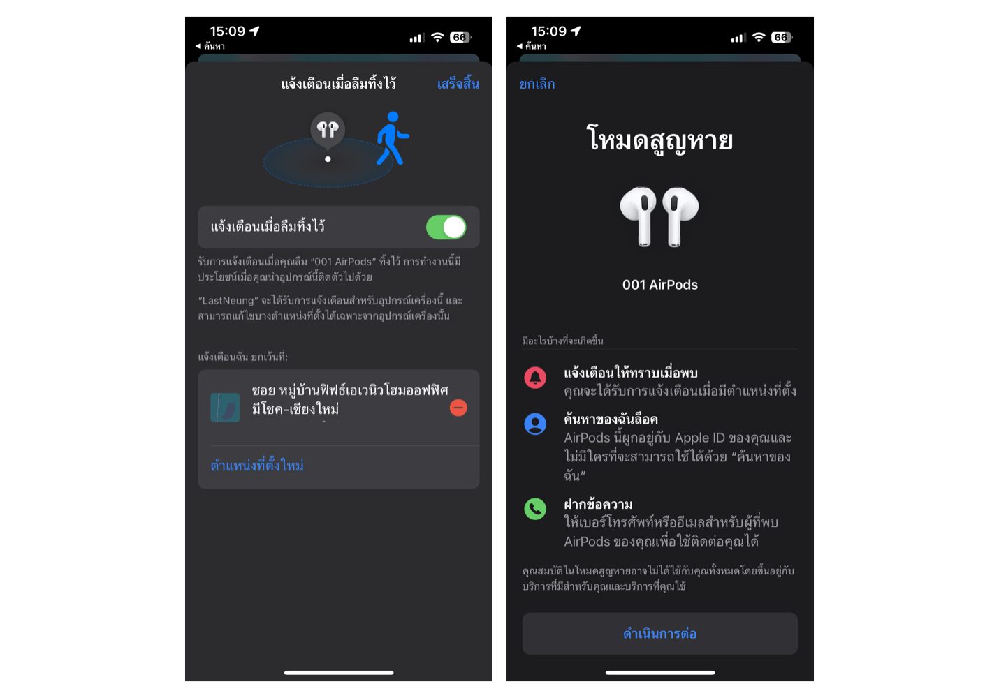 - ระบุว่าสูญหาย: กรณีที่หาอุปกรณ์ไม่เจอจริง ๆ แนะนำให้เปิดใช้งานฟีเจอร์ระบุว่าสูญหาย หากมีคนพยายามเชื่อมต่อกับ AirPods ของเรา ตำแหน่งที่ตั้งของ AirPods ก็จะกลับมาออนไลน์ในแอป Find My อีกครั้ง