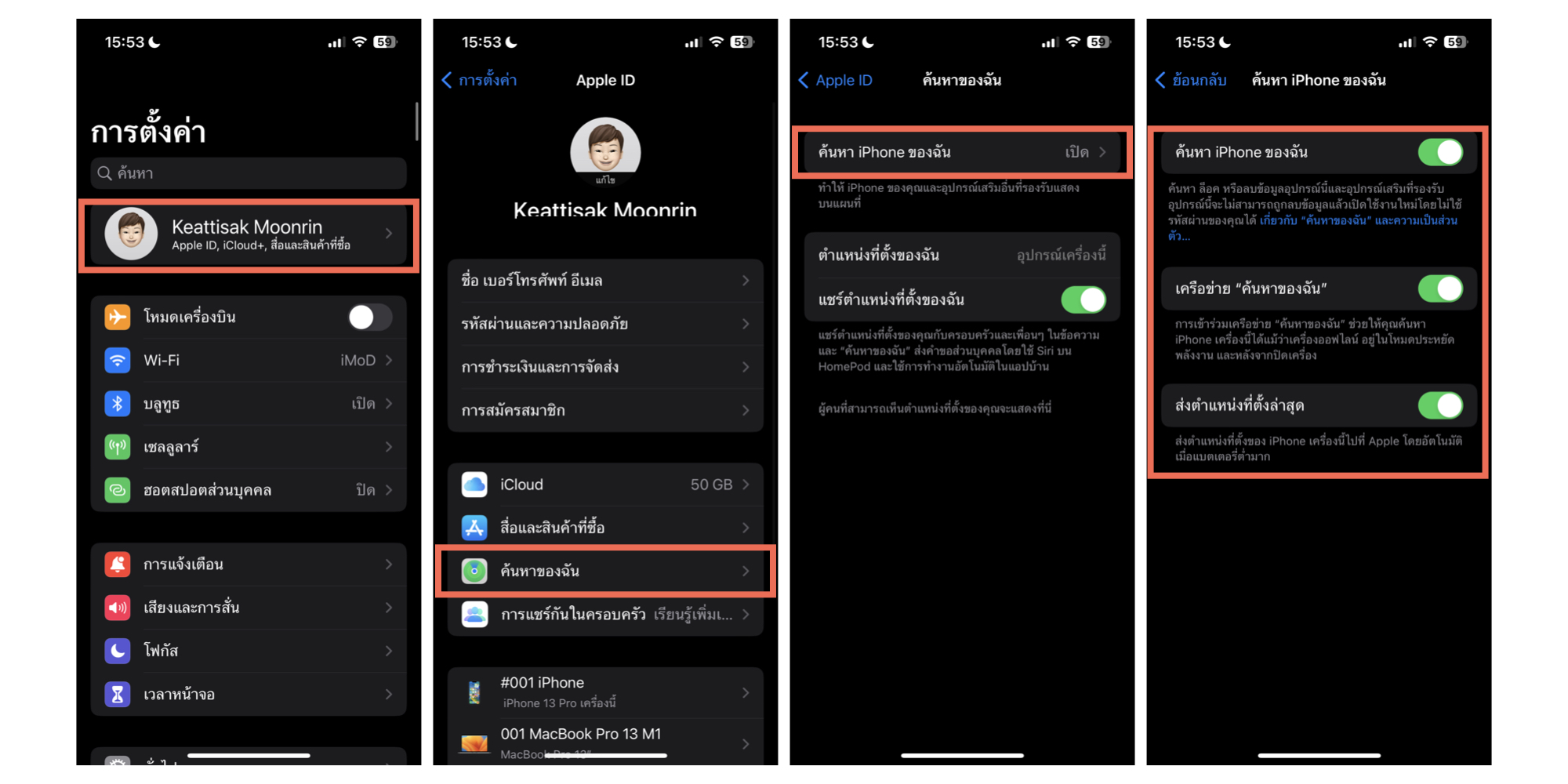 ไปที่การตั้งค่า > เลือก Apple ID > ค้นหาของฉัน > แตะ “ค้นหา iPhone ของฉัน” > เลื่อนเปิด เครือข่าย “ค้นหาของฉัน” (แนะนำให้เลื่อนเปิดไว้ทั้ง 3 ตัวเลือก)