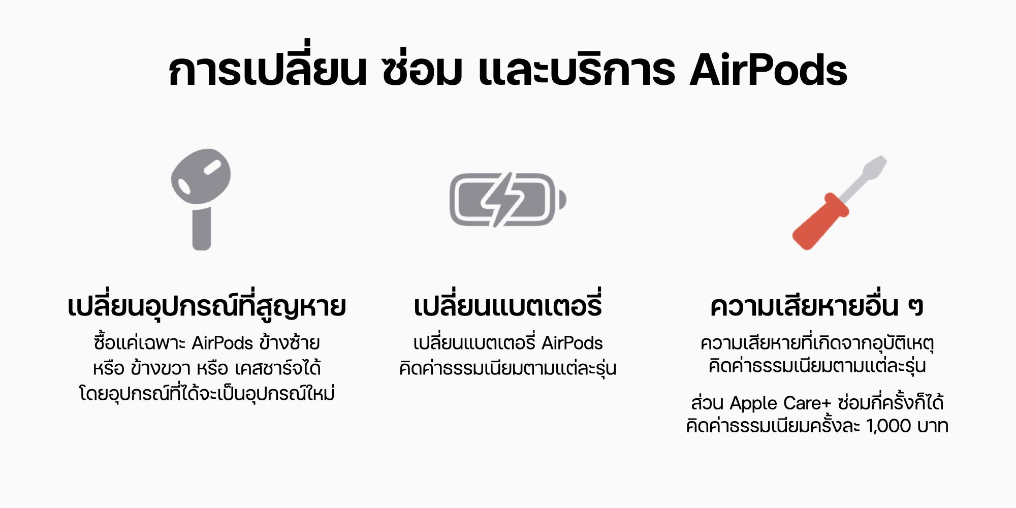 สรุปแล้วใครที่ทำ AirPods พังหรือสูญหายข้างใดข้างหนึ่งรวมถึงเคสชาร์จด้วย ก็สามารถเข้าไปใช้บริการเปลี่ยน ซ่อม AirPods ของ Apple ได้เลย ซึ่งแต่ละรุ่นก็จะมีราคาค่าธรรมเนียมระบุชัดเจน รู้แบบนี้ไม่ต้องซื้อหรือเปลี่ยนใหม่ยกเซ็ตแล้ว ส่วนใครที่อยากเอาชัวร์จะซื้อบริการ Apple Care+ ไว้ก็ได้นะ