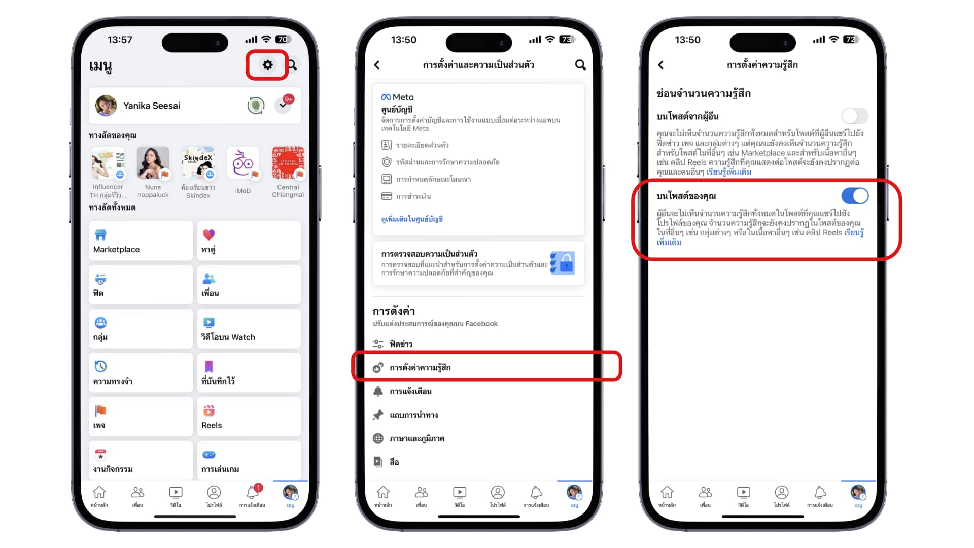 ให้แตะที่รูปโปรไฟล์ของเรา > แตะที่ สัญลักษณ์การตั้งค่า > การตั้งค่าความรู้สึก > ที่หน้าตั้งค่าซ่อนจำนวนความรู้สึก ให้เลือกเปิด “บนโพสต์ของคุณ”