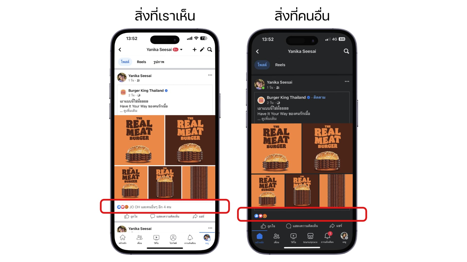 เมื่อเราเปิดการตั้งค่านี้ เราที่เป็นเจ้าของบัญชีจะยังเห็นจำนวนการกดถูกใจอยู่ แต่คนอื่นจะไม่เห็น จะเห็นเฉพาะการแสดงความรู้สึกว่าเป็นการกดไลก์ กดหัวใจ กดหัวเราะ กดร้องไห้ หรือกดโกรธ เท่านั้น