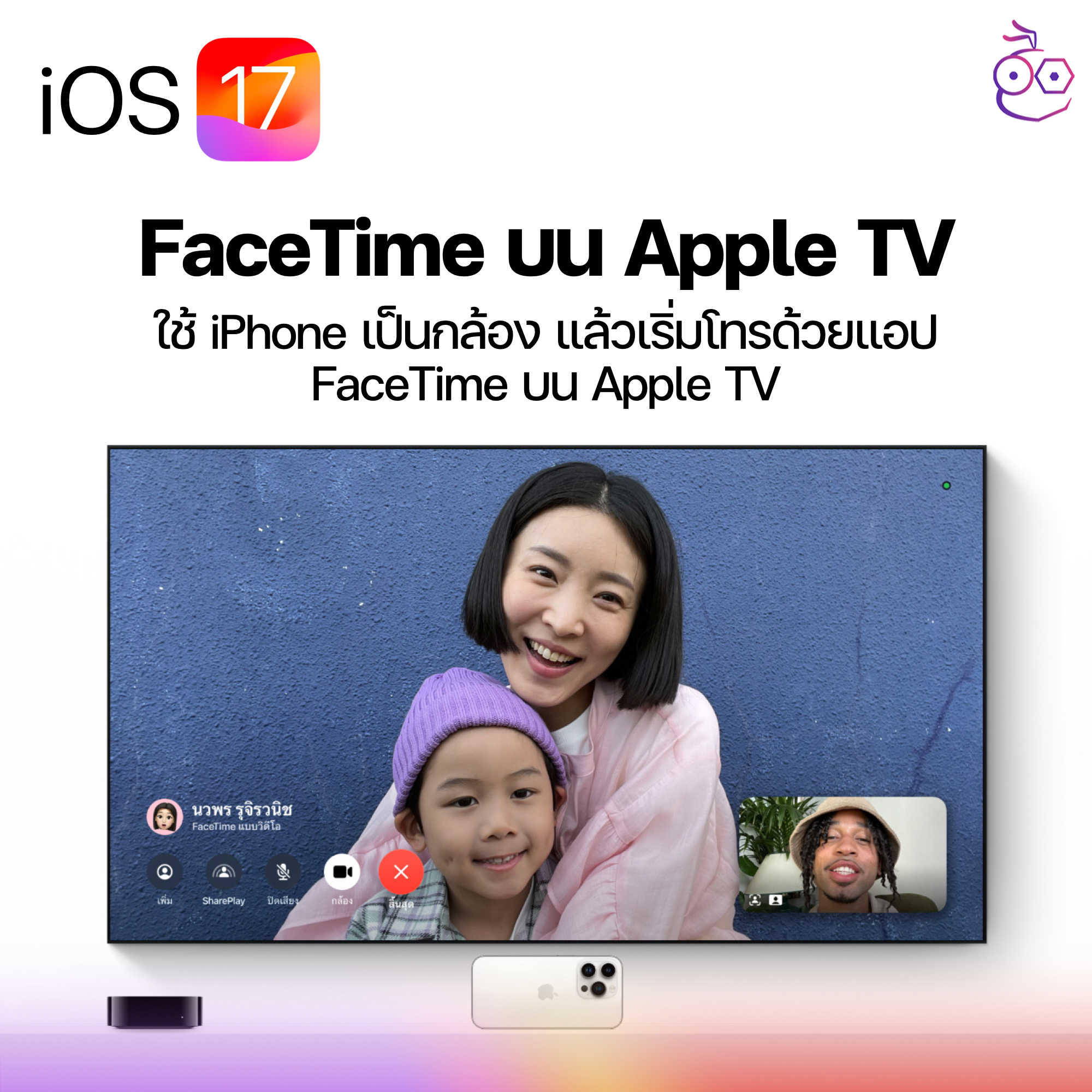 สามารถใช้ iPhone เป็นกล้องเว็บแคม แล้วเริ่มโทรด้วยแอป FaceTime บน Apple TV หรือจะส่งต่อการโทรจาก iPhone ไปที่ทีวีก็ได้ ช่วยให้การโทรแบบวิดีโอชัดเจนขึ้นบนหน้าจอทีวีใหญ่ ๆ