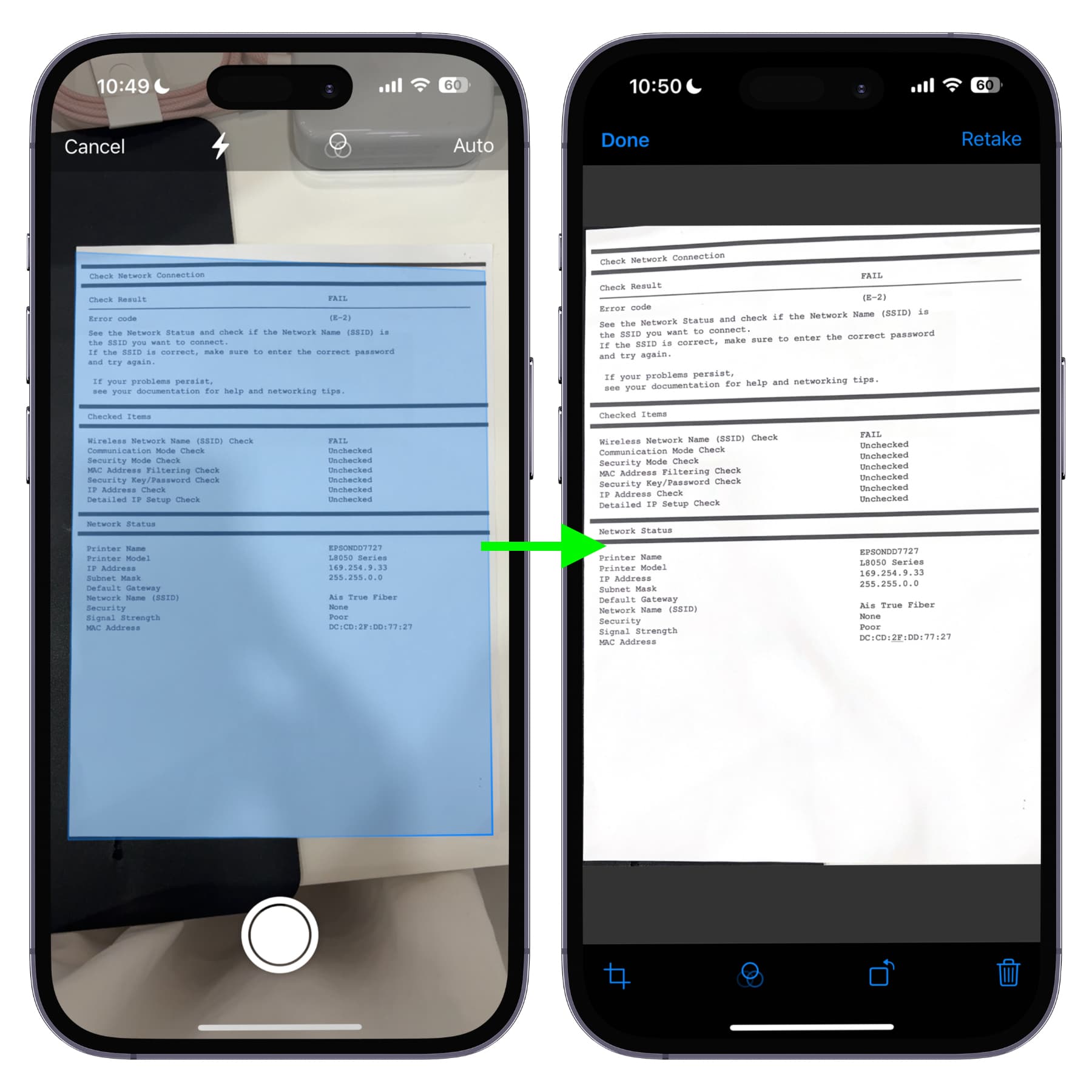 นำ iPhone ไปสแกนเอกสาร เมื่อกล้องจับได้ว่าเป็นเอกสาร ให้ถือเครื่องไว้นิ่ง ๆ ก็จะมีการกดสแกนให้เราทันที เราไม่ต้องกดปุ่มเองก็ได้