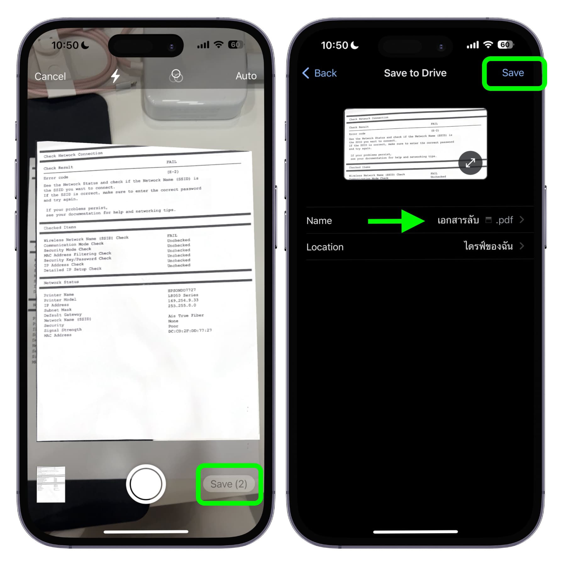 เมื่อสแกนเสร็จแล้วให้แตะ “Save(n)” ที่มุมล่างขวา จากนั้นก็ให้ตั้งชื่อไฟล์เอกสารให้เรียบร้อย จากนั้นก็กด “Save” เป็นอันเสร็จ