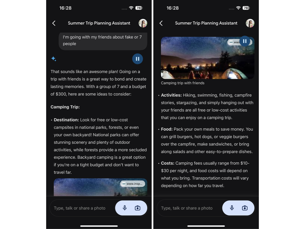 สามารถพิมพ์ถามเป็นภาษาไทยหรือภาษาอังกฤษ, แตะไมค์คุยแชทกับ Gemini (ตอนนี้รองรับแค่ภาษาอังกฤษ) หรือเพิ่มรูปภาพแล้วใช้ Gemini ช่วยทำงานได้เลย