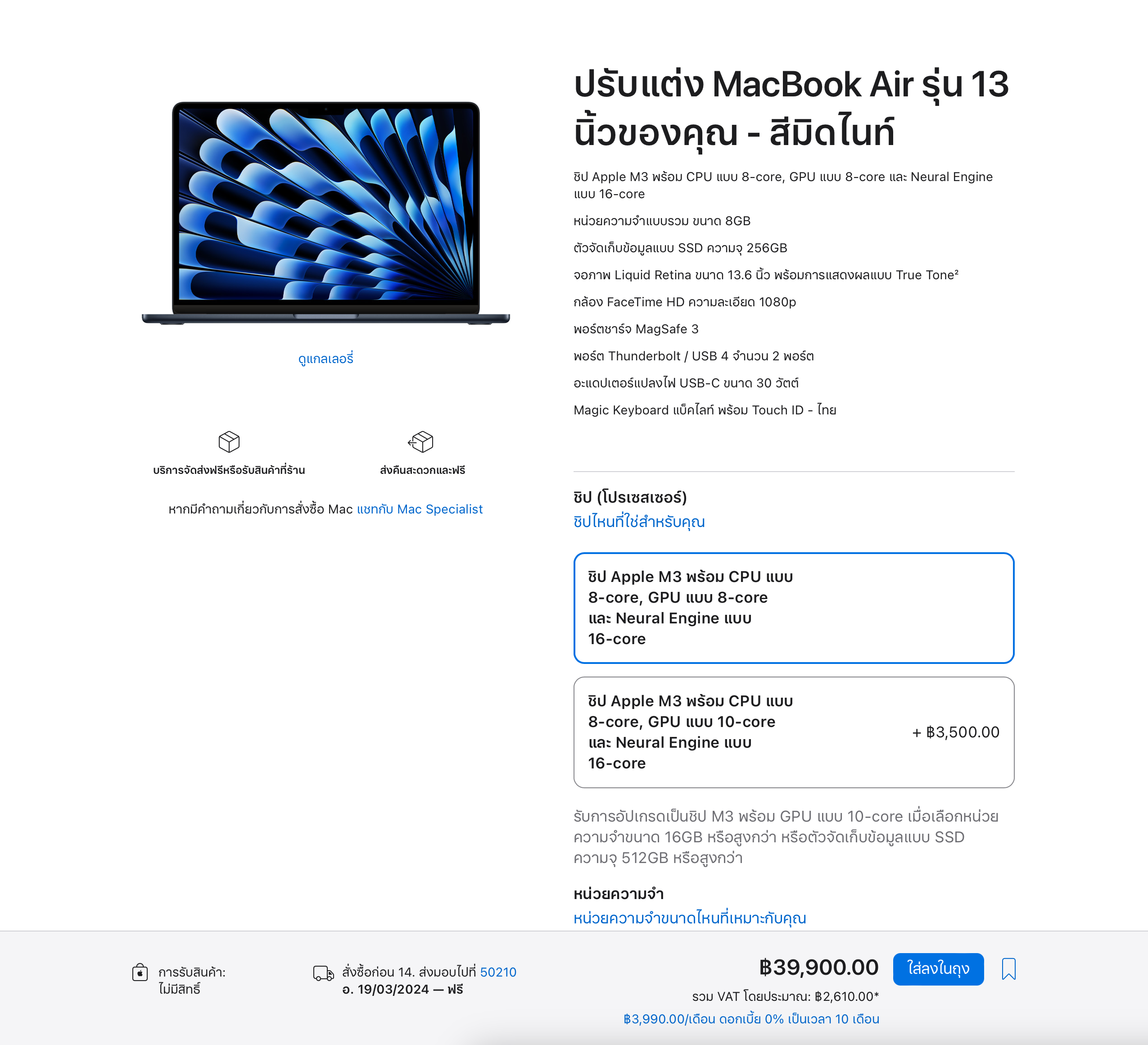 15 มี.ค. 2024, Apple ได้เปิดให้สั่งซื้อล่วงหน้า MacBook Air ชิป M3 ในไทยแล้ว! ราคาเริ่มต้น 39,900 บาท คาดเปิดขายหน้าร้านในสัปดาห์ถัดไป