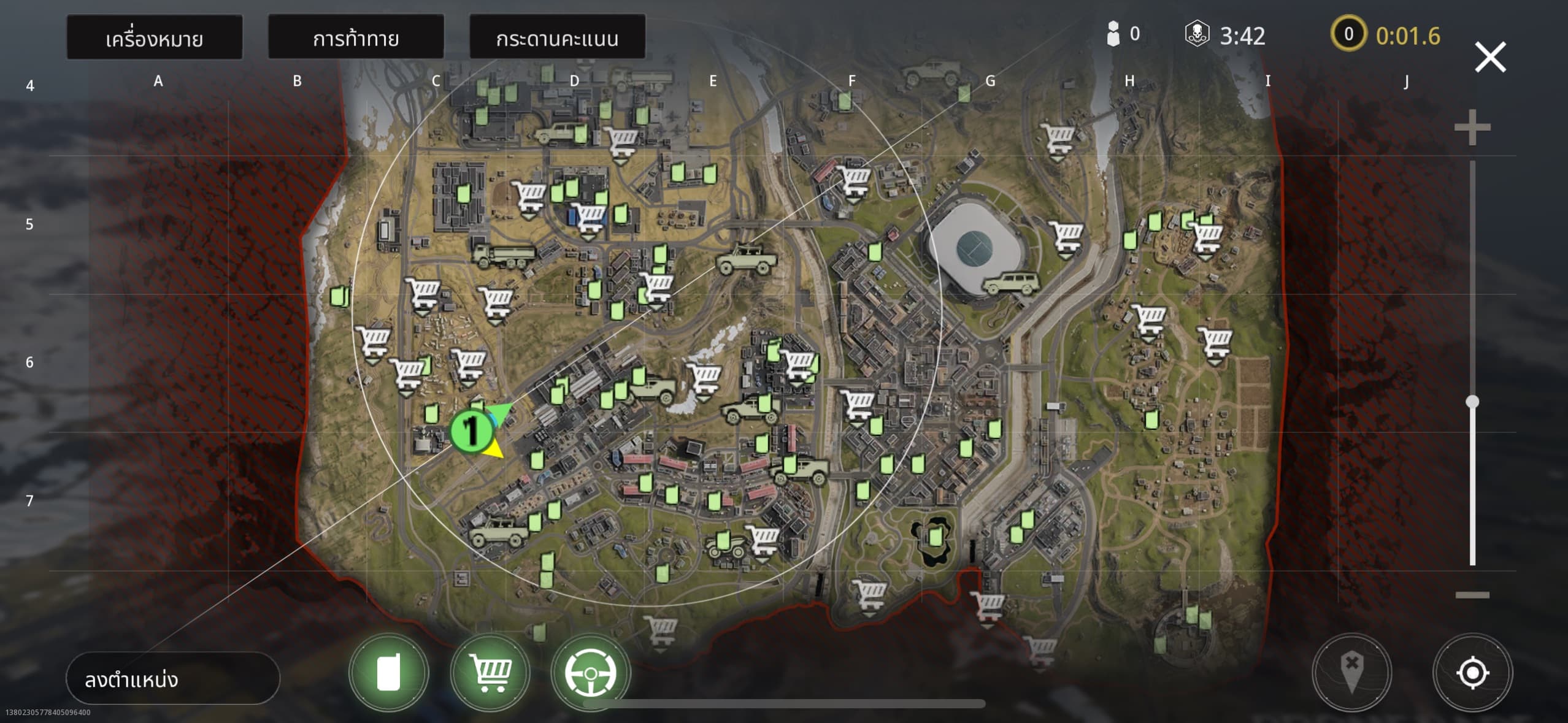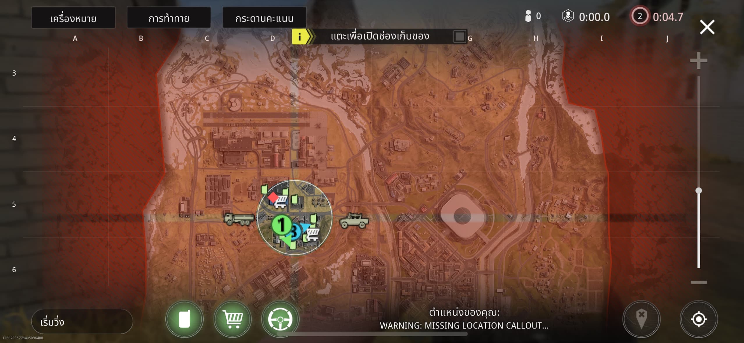 แผนที่สำหรับโหมด Battle Royal ที่ทีมงานลองเล่น จะมีสัญลักษณ์ของสิ่งต่าง ๆ บอกอยู่ เช่นร้านค้า ยานพาหนะ