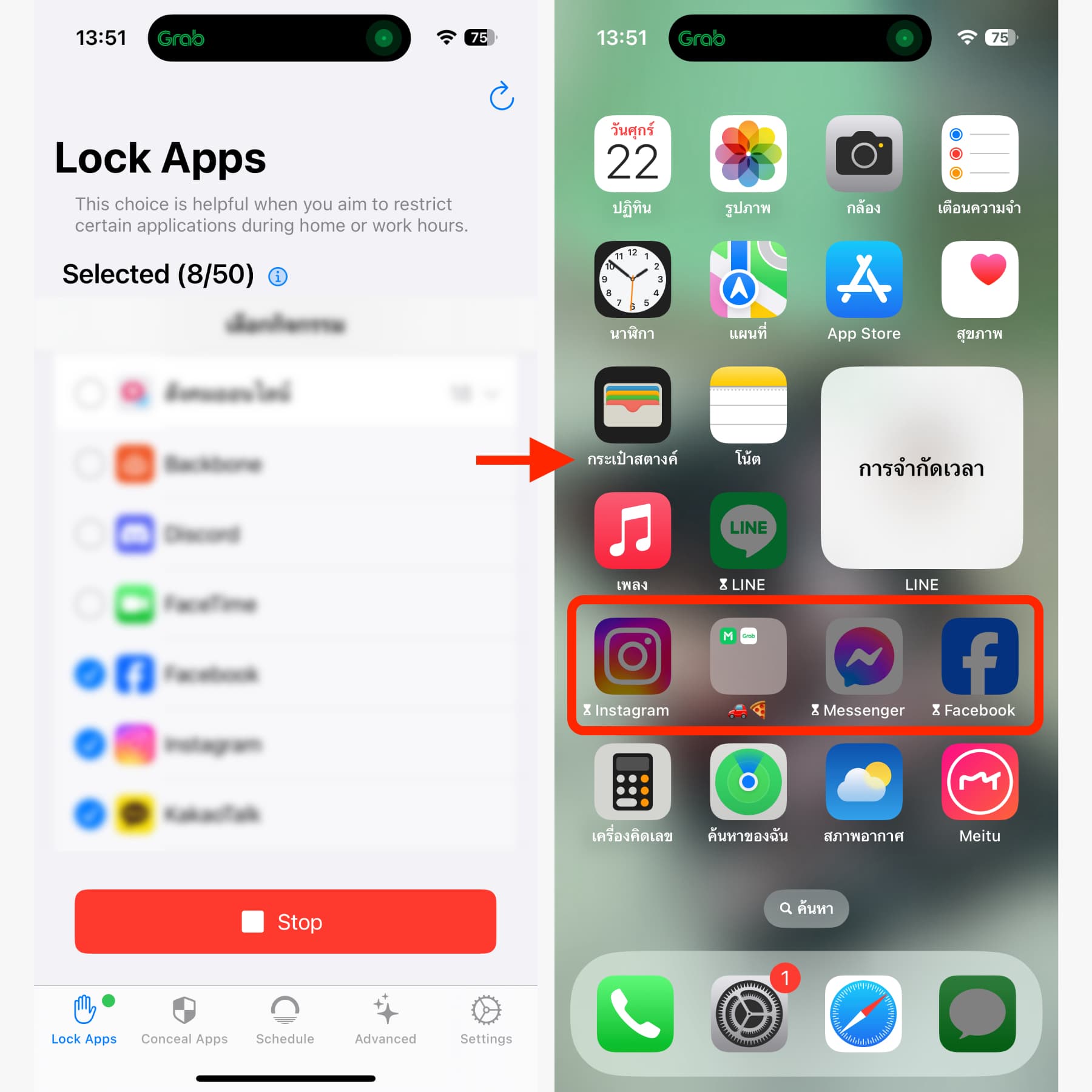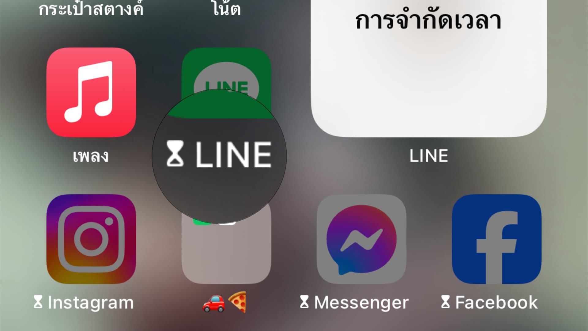 พอเกิดการล็อกที่หน้าการตั้งค่าเมื่อครู่จะมีการเบลอเมนู แปลว่าเราล็อกแอปสำเร็จแล้ว > ลองออกไปดูที่หน้าจอโฮมก็จะเห็นว่า แอปที่ถูกล็อกจะมีไอค่อนนาฬิกาทรายอยู่หน้าชื่อแอปนั้น ๆ