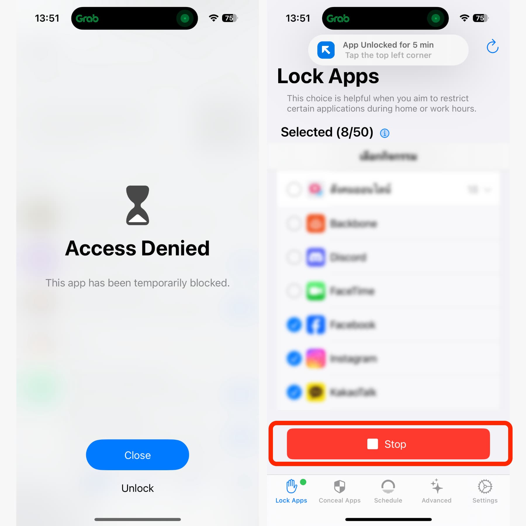 หากอยากปลดล็อกให้เข้าไปปลดล็อกในแอป โดยให้กดปุ่ม “Stop” เพื่อยกเลิกการล็อก จากนั้นก็ใช้งานแอปได้ปกติเลย