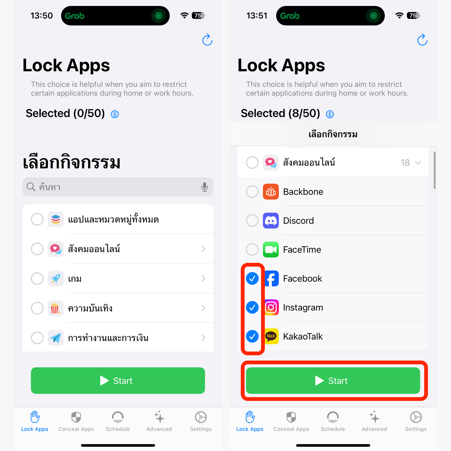 พอเลือกแอปเสร็จแล้ว ให้กดปุ่ม “Start” เพื่อเริ่มล็อกแอปได้เลย