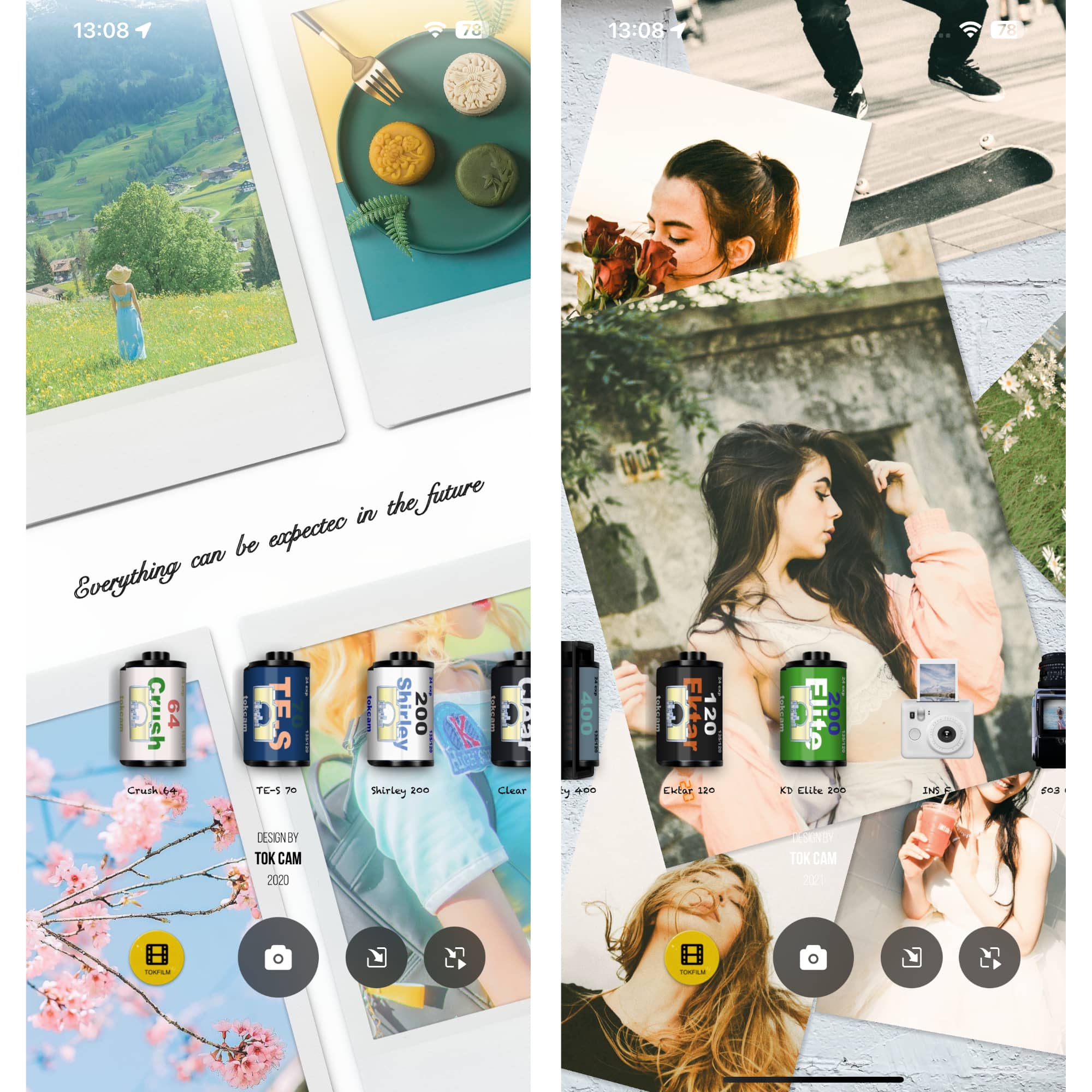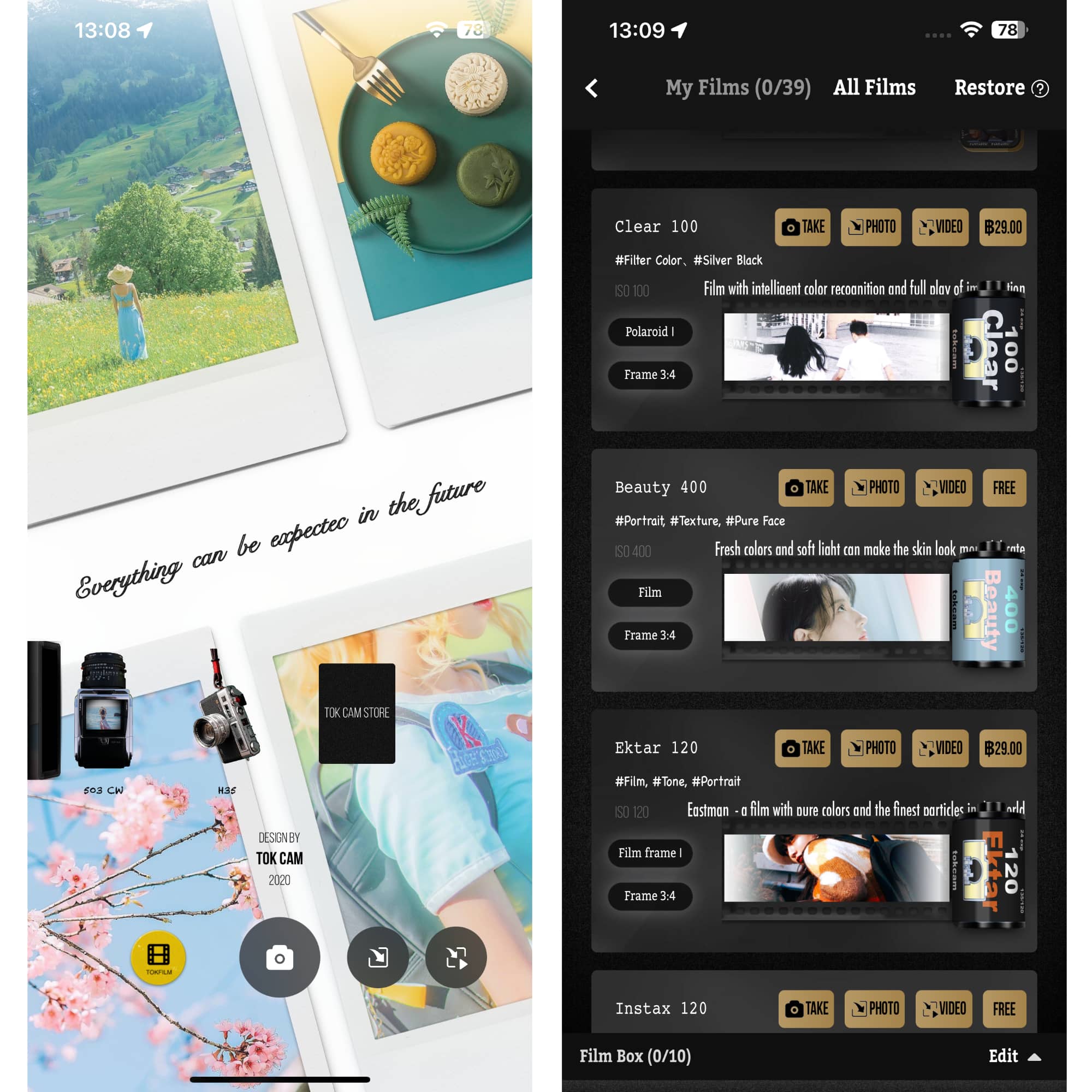 และถ้าเราเลื่อนมาดูกล้องฟิล์มจนถึงอันสุดท้าย ให้เรากด “TOK CAM STORE” ก็จะมีฟิล์มกล้องให้เลือกหลากหลายประเภทให้เลือกใช้เพิ่มเติมเยอะมาก มีทั้งแบบฟรีและเสียเงินนะ
