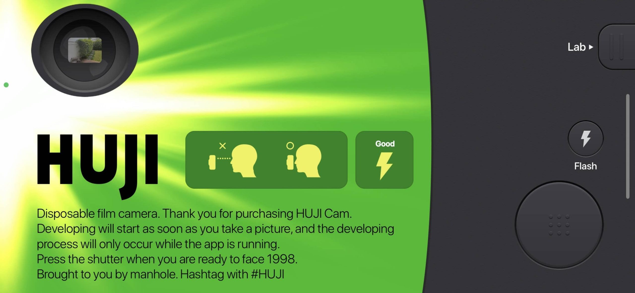 แอปกล้องฟิล์ม Huji โดยที่ตัวแอปจะใช้งานเป็นแนวนอนนะ ให้กดรูปเลนส์กล้องมุมบนซ้ายเพื่อถ่ายรูปได้เลยนะ