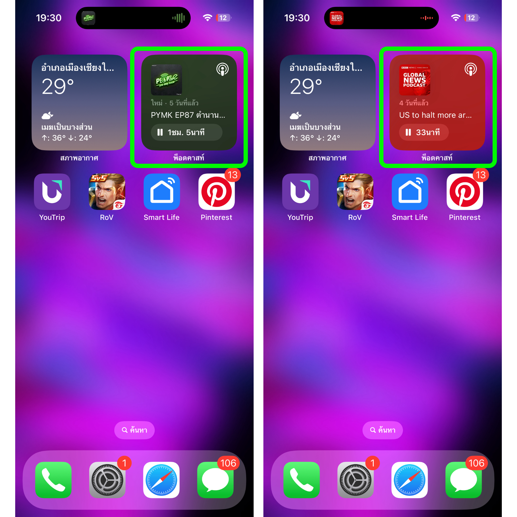 สีของวิดเจ็ต แอป Podcast ใน iOS 17.5 จะปรับเปลี่ยนตามสีของปก (cover) ของพ็อดคาสท์ที่คุณกำลังฟังอยู่