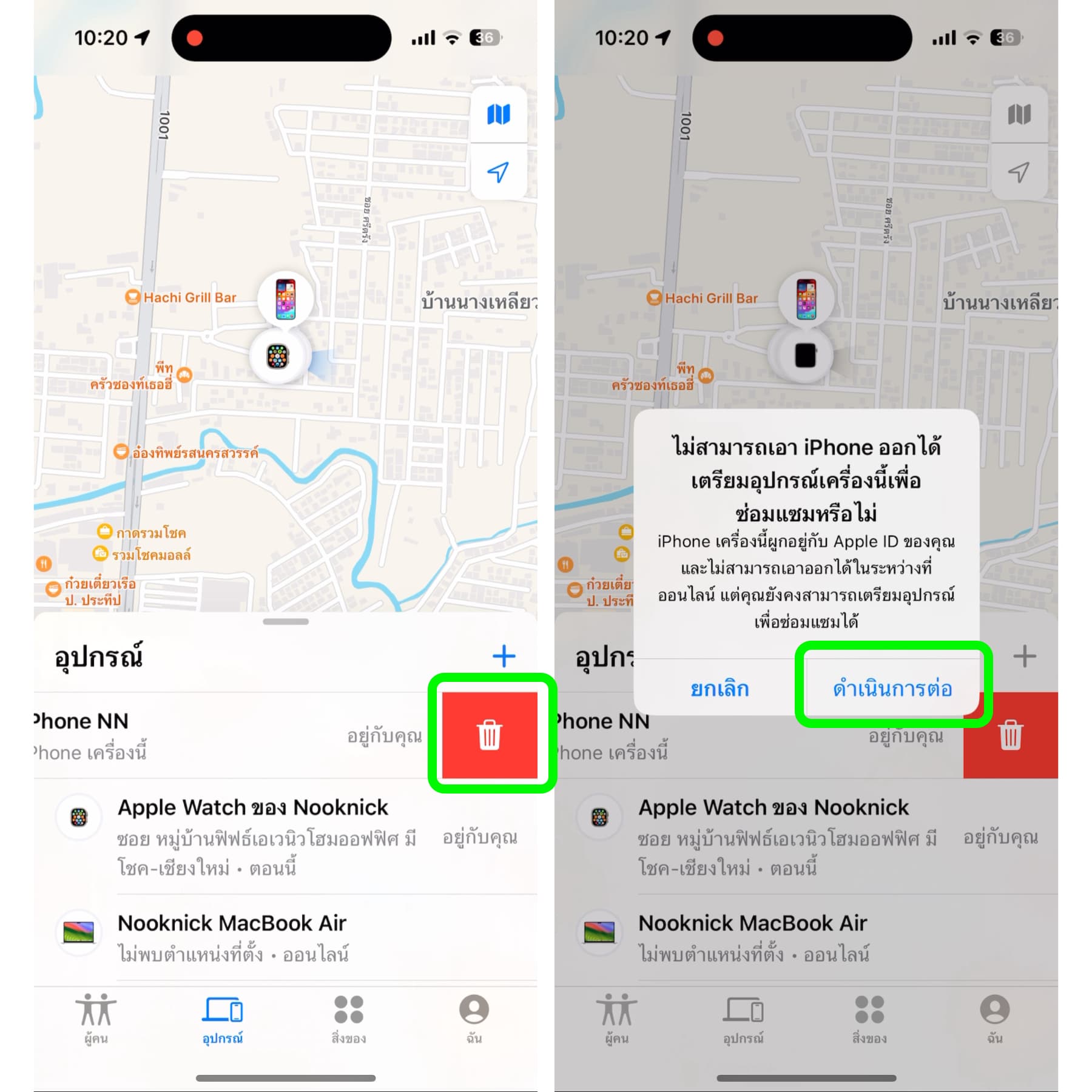 วิธีเปิดใช้งาน ให้เข้าไปที่แอปค้นหาของฉัน > ที่ชื่อ iPhone ของคุณจากรายการอุปกรณ์ ให้ปัดไปทางซ้าย จะมีไอค่อนถังขยะสีแดงปรากฏขึ้นมา > แตะที่ไอค่อนถังขยะจะมีหน้าต่างปรากฏขึ้นมา ให้แตะ “ดำเนินการต่อ”