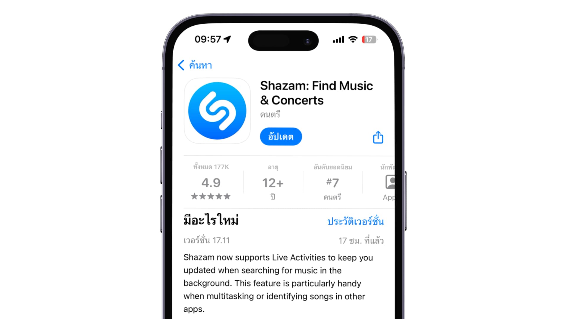 Shazam เวอร์ชันใหม่ 17.11 สามารถฟังเพลงต่อเนื่องเพื่อค้นหาเพลง ชื่อเพลง ศิลปิน และสามารถแสดงผลผ่าน Live Activities หรือ Dynamic Island บน iPhone ได้แล้ว