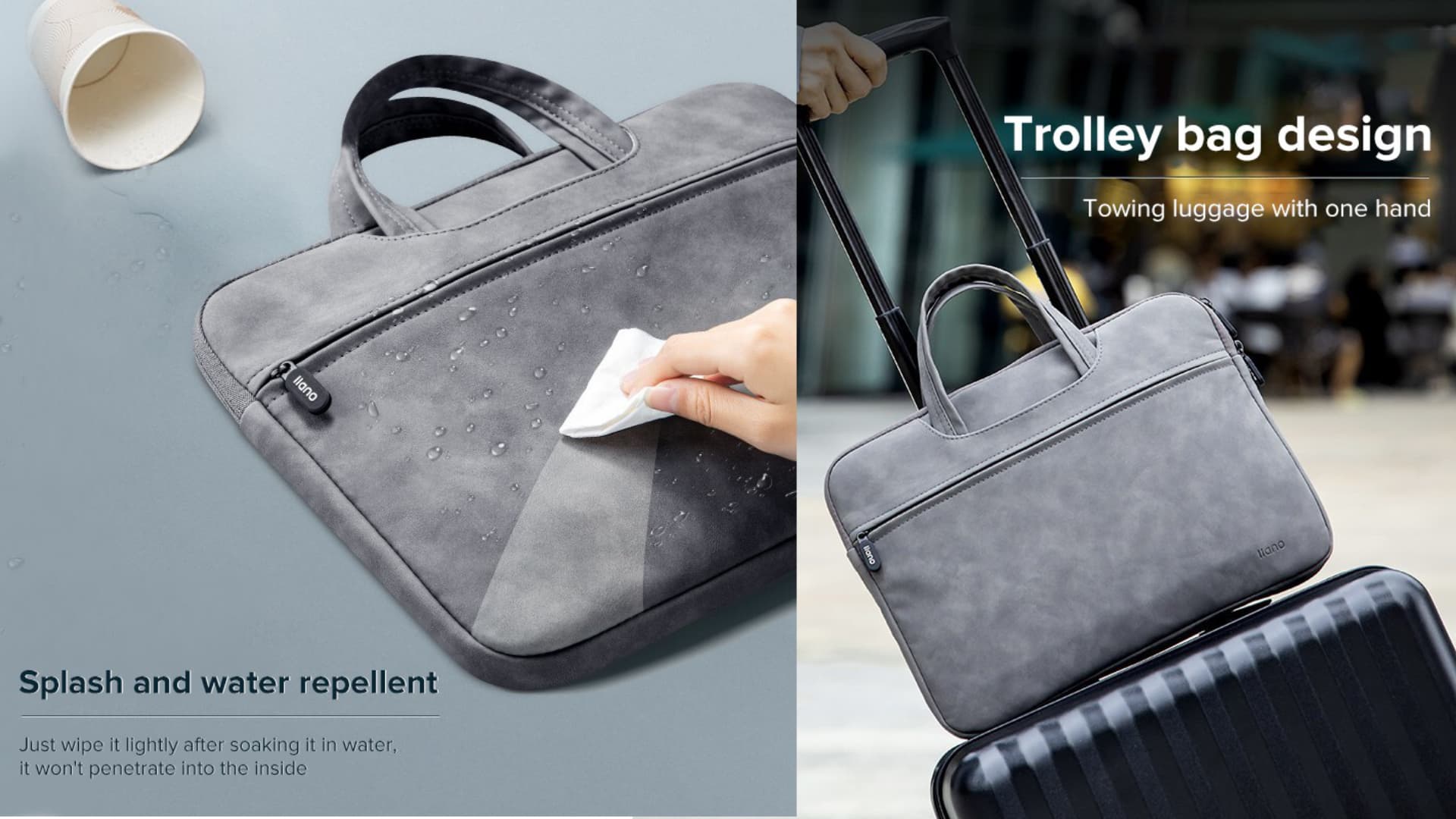 ด้วยความที่เป็นวัสดุหนังเทียมทำให้กระเป๋า MacBook รุ่นนี้มีคุณสมบัติกันน้ำ เวลามีคราบสกปรกก็สามารถทำความสะอาดได้ง่ายกว่าแบบผ้า กระเป๋ามีการบุขนนุ่มด้านในช่วยถนอมตัวเครื่อง มีช่องเก็บอุปกรณ์ต่าง ๆ เพิ่มที่ด้านหน้า