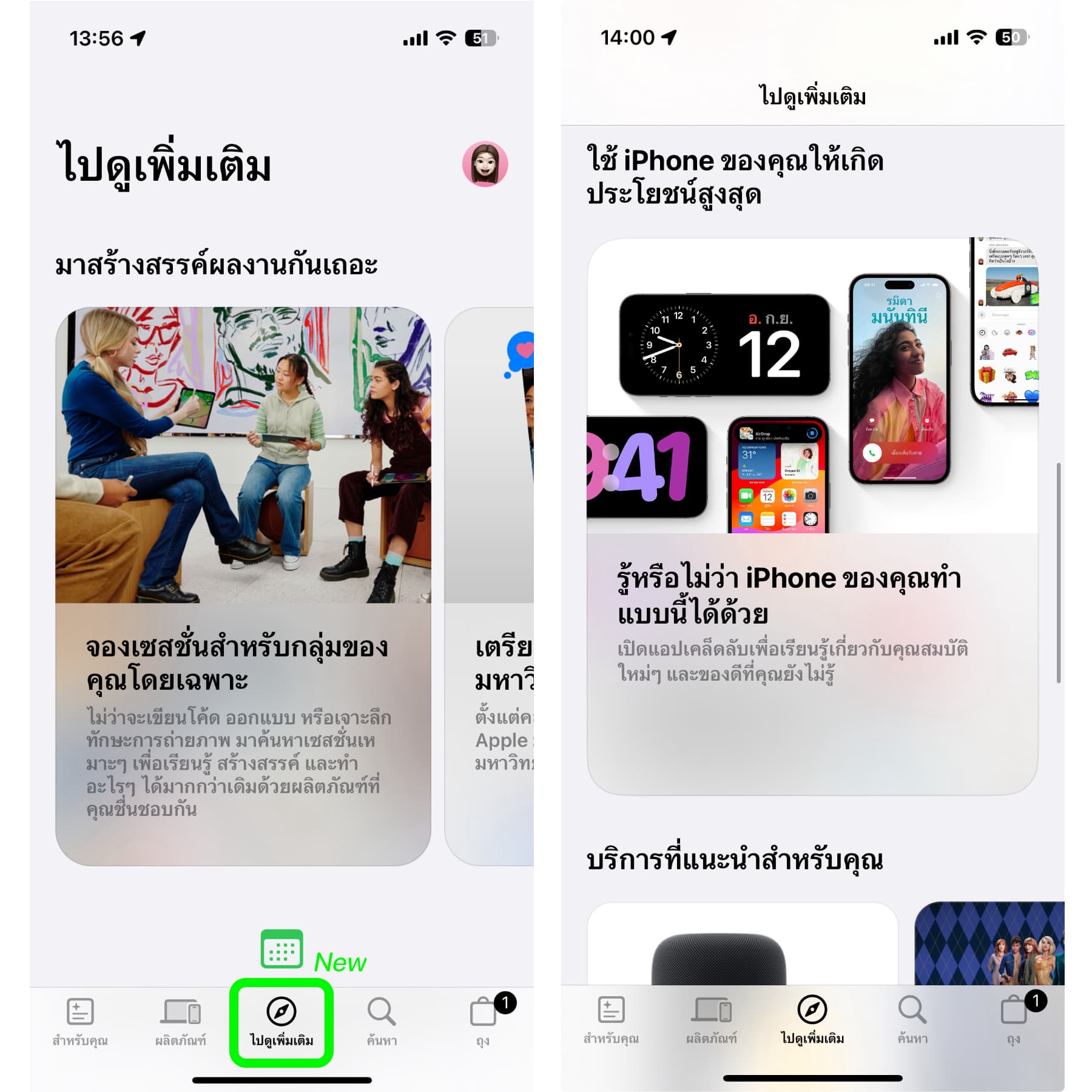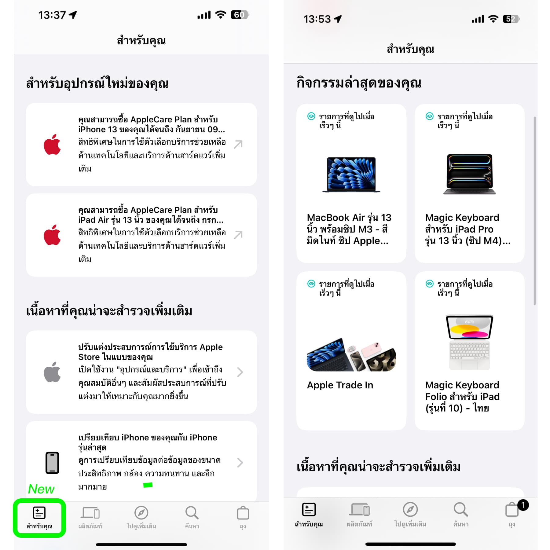 การอัปเดตครั้งนี้ มีการเพิ่มเมนู “สำหรับคุณ” ที่มีความเฉพาะบุคคลยิ่งขึ้น ทำให้ผู้ใช้สามารถดูเนื้อหาที่ตรงกับความสนใจ เช่น การดูสินค้าล่าสุด คำแนะนำในการซื้อ AppleCare+ สำหรับอุปกรณ์ที่ผู้ใช้มี หรือจะเป็นคำแนะนำเกี่ยวกับการทดลองใช้บริการชอง Apple ฟรี 3 เดือน