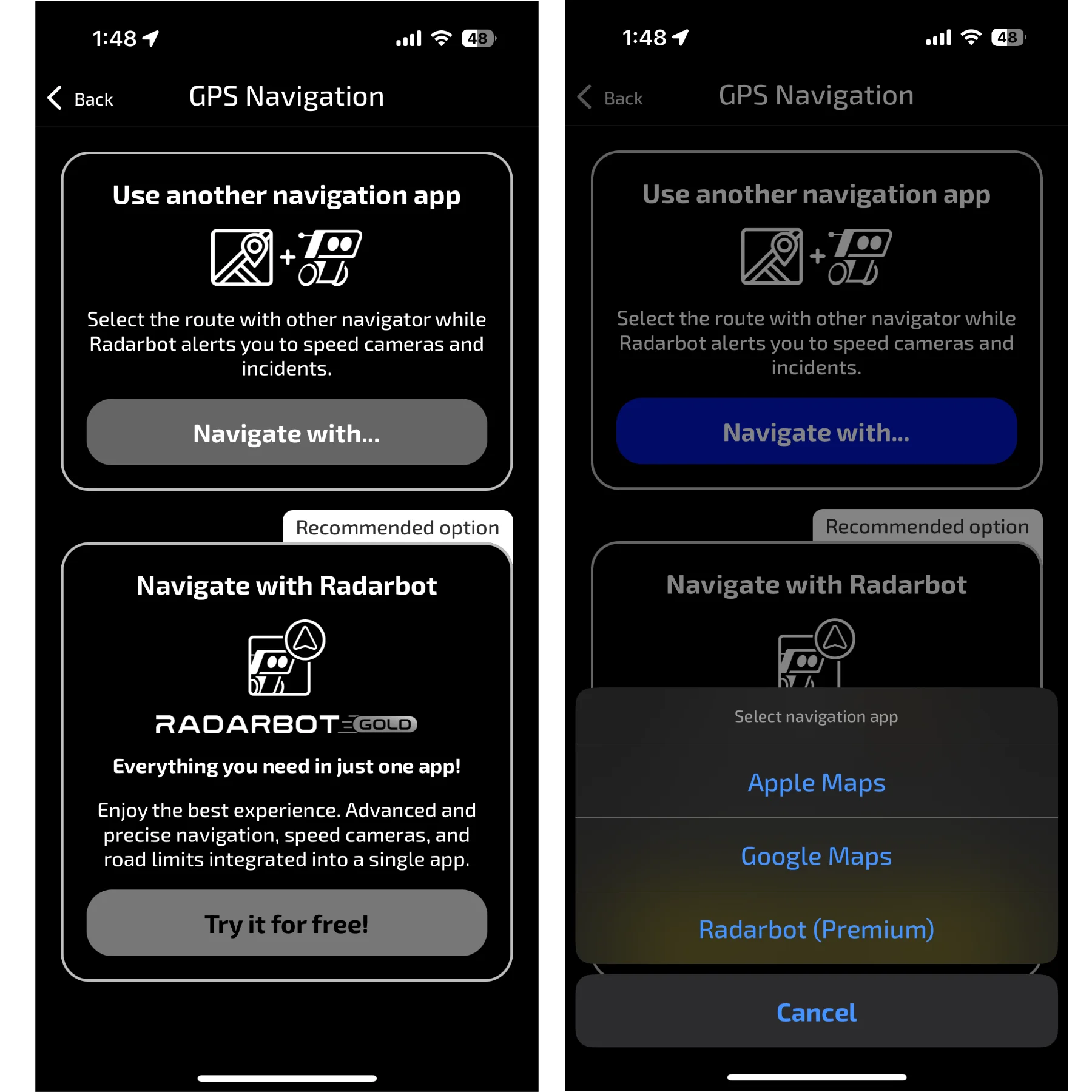 - สามารถใช้งานร่วมกับแอปนำทางยอดนิยม เช่น Google Maps และ Waze ได้ ทำให้คุณสามารถใช้แอปนำทางที่คุณคุ้นเคยพร้อมกับรับการแจ้งเตือนจาก Radarbot