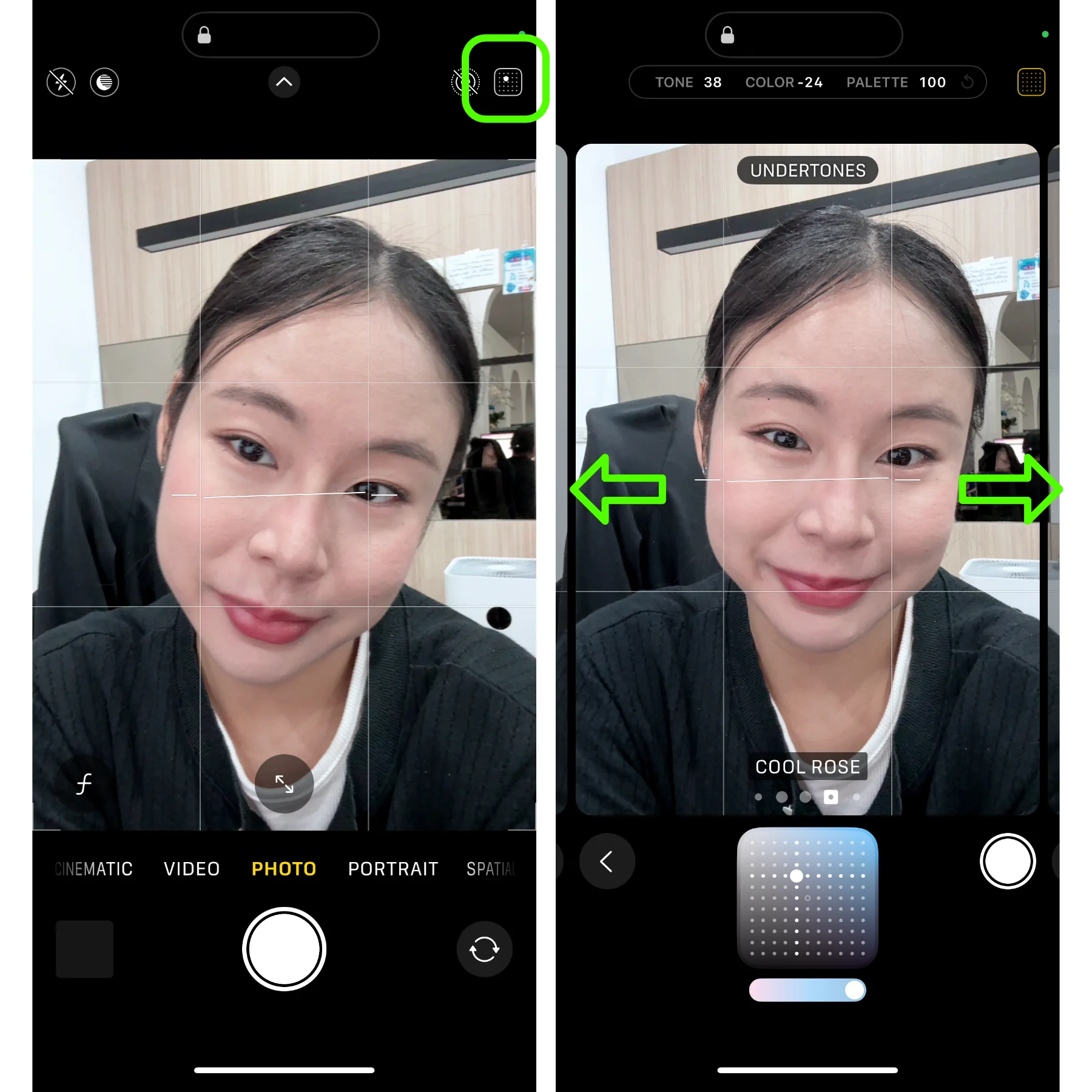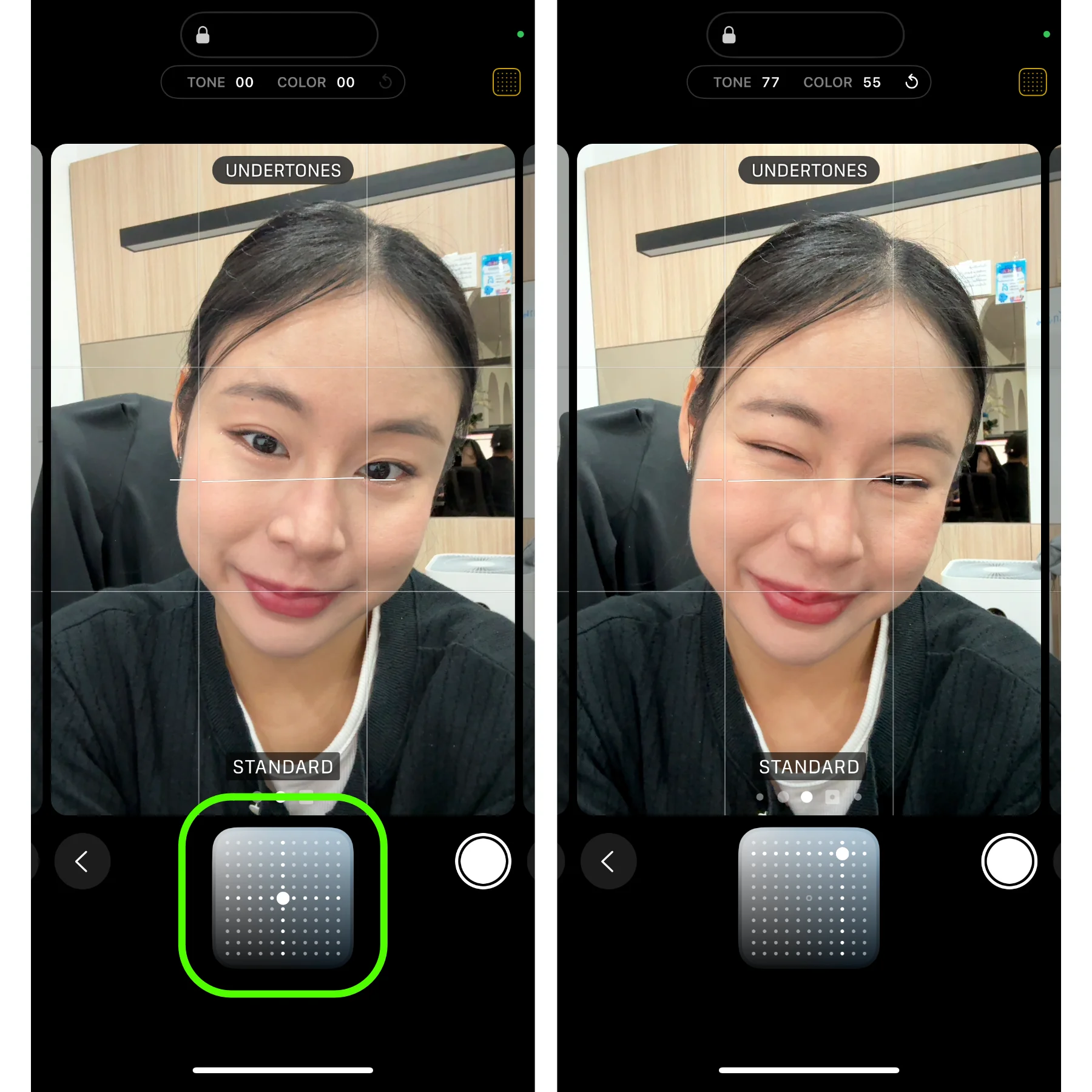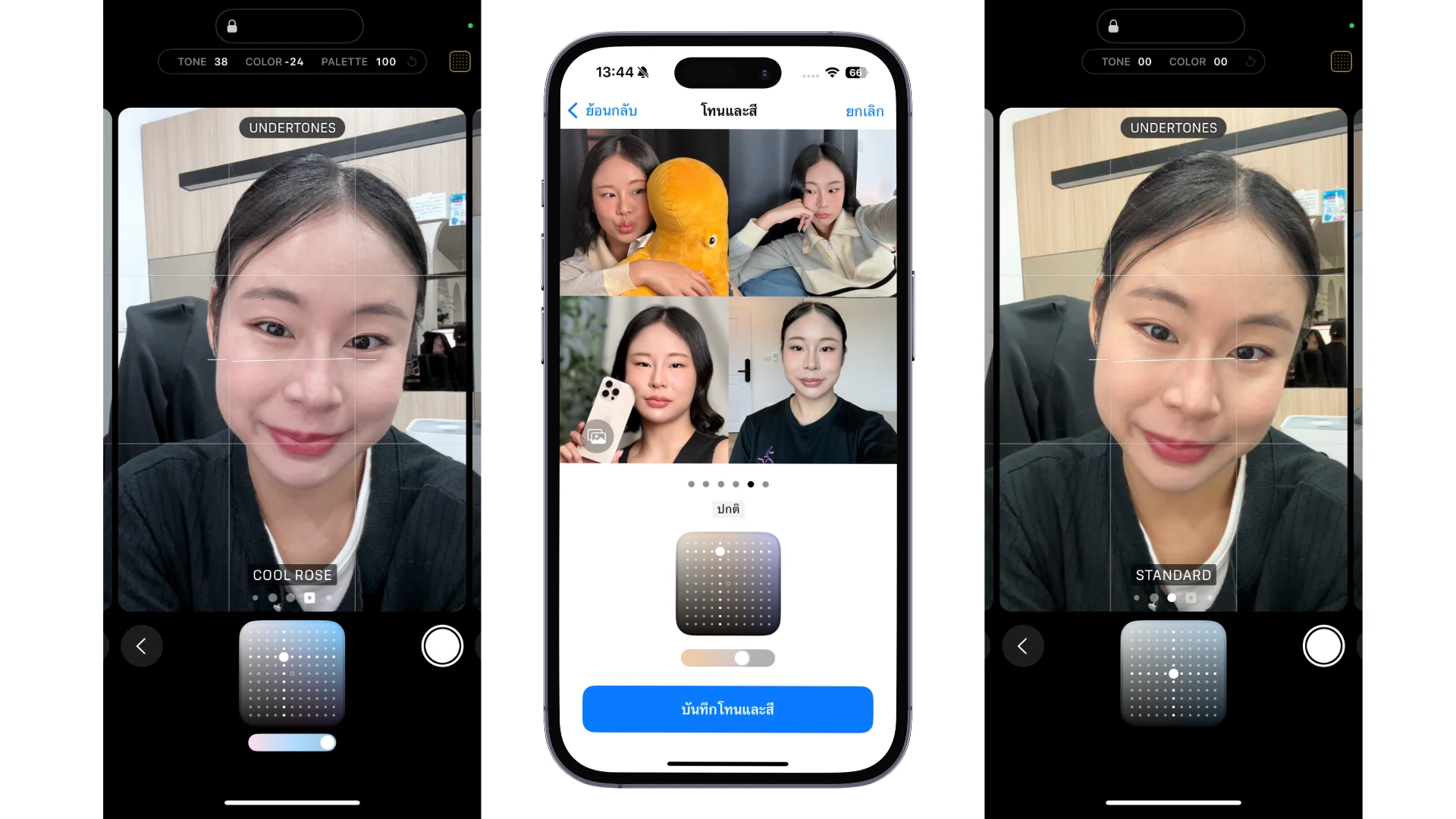 ตัวอย่างที่แสดงจะเป็นโทนภาพที่คุณจะได้เมื่อคุณกดถ่ายรูป และเมื่อเปิดแอปกล้องขึ้นมาใหม่ทุกครั้ง จะมีการล็อคโทนนี้ให้คุณใช้งานเสมอ