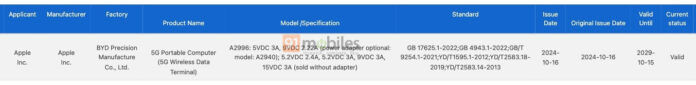 91Mobiles รายงานข้อมูลว่า China Compulsory Certificate (3C) ยืนยันว่า iPad mini 7 เลขโมเดล A2996 รองรับการชาร์จเร็วสูงสุด 20W ที่กำลังไฟ 9VDC x 2.22A ซึ่งเป็นสเปคแบบเดียวกันกับ iPad mini 6