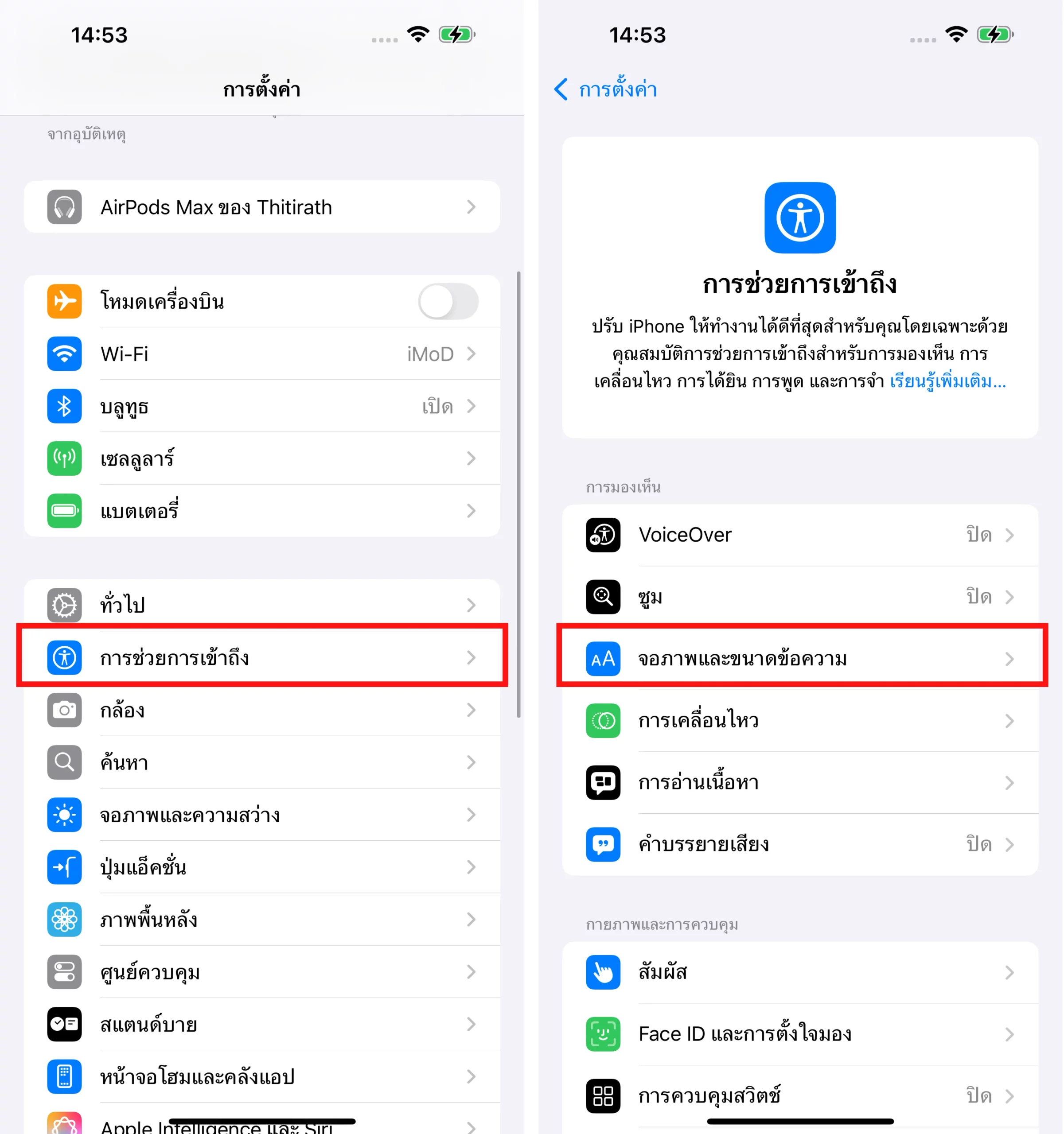ไปที่แอปการตั้งค่า > การช่วยการเข้าถึง > หน้าจอและขนาดข้อความ