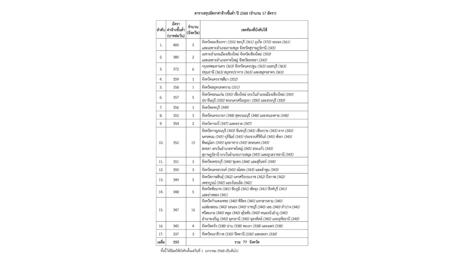 เคาะแล้ว ! ค่าแรงขั้นต่ำใหม่ มีผลใช้ตั้งแต่วันที่ 1 ม.ค. 2568 นี้