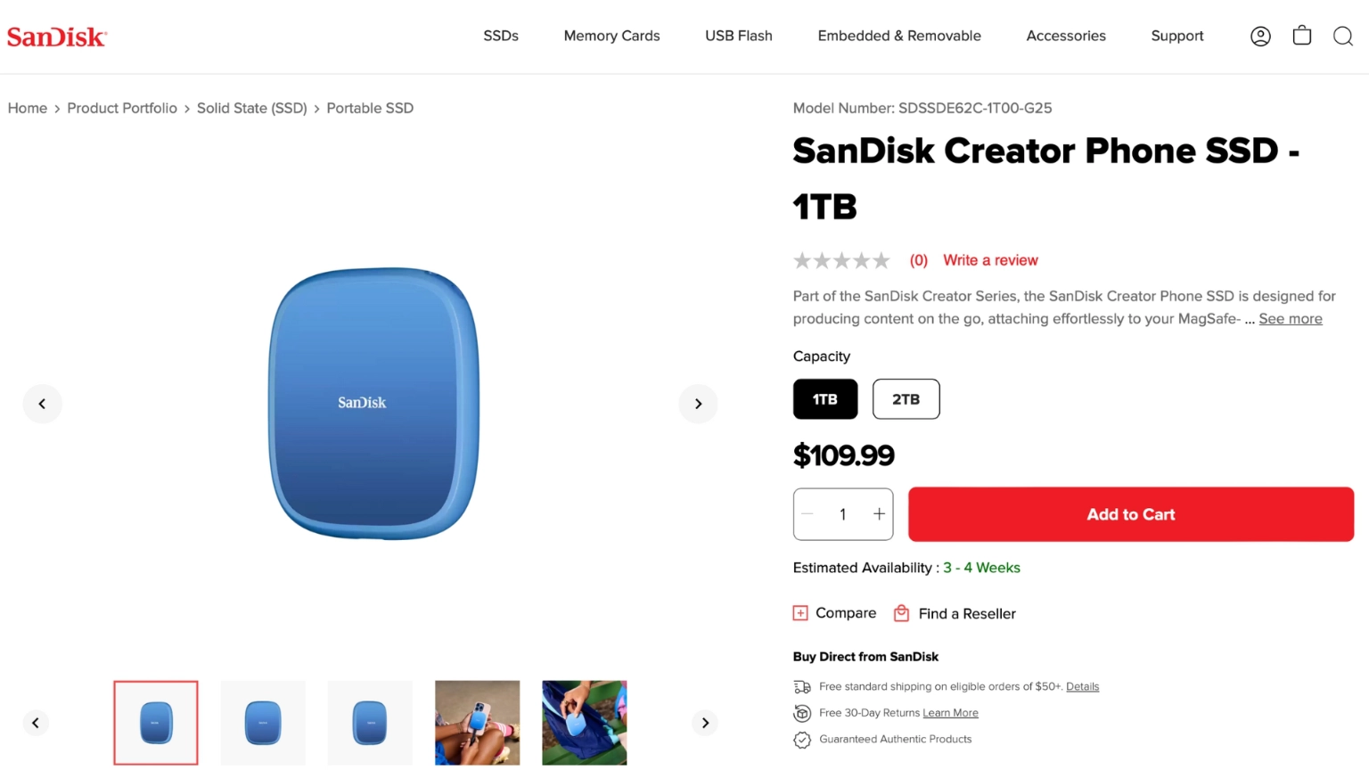 SanDisk Creator Phone SSD มีกำหนดวางจำหน่ายในช่วง ฤดูใบไม้ผลิปี 2025 ซึ่งเหมาะสำหรับผู้ใช้งานที่ต้องการพื้นที่จัดเก็บข้อมูลเพิ่มเติมสำหรับการบันทึกวิดีโอคุณภาพสูงและการทำงานที่ต้องการความสะดวกและประสิทธิภาพสูงสุด