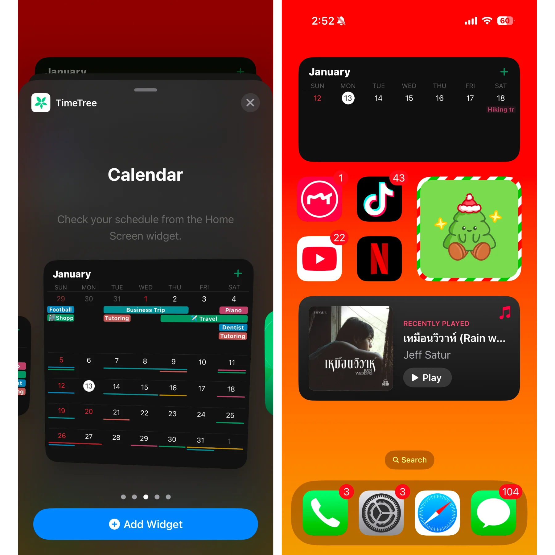 TimeTree มีวิดเจ็ตที่ช่วยให้คุณดูตารางเวลาได้อย่างรวดเร็วบนหน้าจอโฮม นอกจากนี้ยังสามารถใช้งานผ่านเว็บไซต์บน PC ได้ ทำให้คุณสามารถเข้าถึงปฏิทินของคุณได้ทุกที่ทุกเวลา